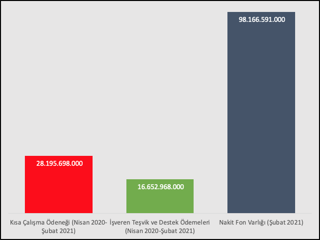 Nisan 2020 ile Şubat 2021 dönemi arasında Covid-19 kapsamında İşsizlik Sigortası Fonu’ndan işçilere 28 milyar TL kısa çalışma ödemesi yapıldı. Covid-19 ödeneklerinin aslan payını KÇÖ oluşturdu. Aynı dönemde işverenlere yapılan teşvik ödemelerine ise 16,7 milyar TL ayrıldı. 3,8 milyon işçiye 28 milyar TL KÇÖ ayrılırken işverenlere 16,7 milyar doğrudan teşvik ayrıldı.