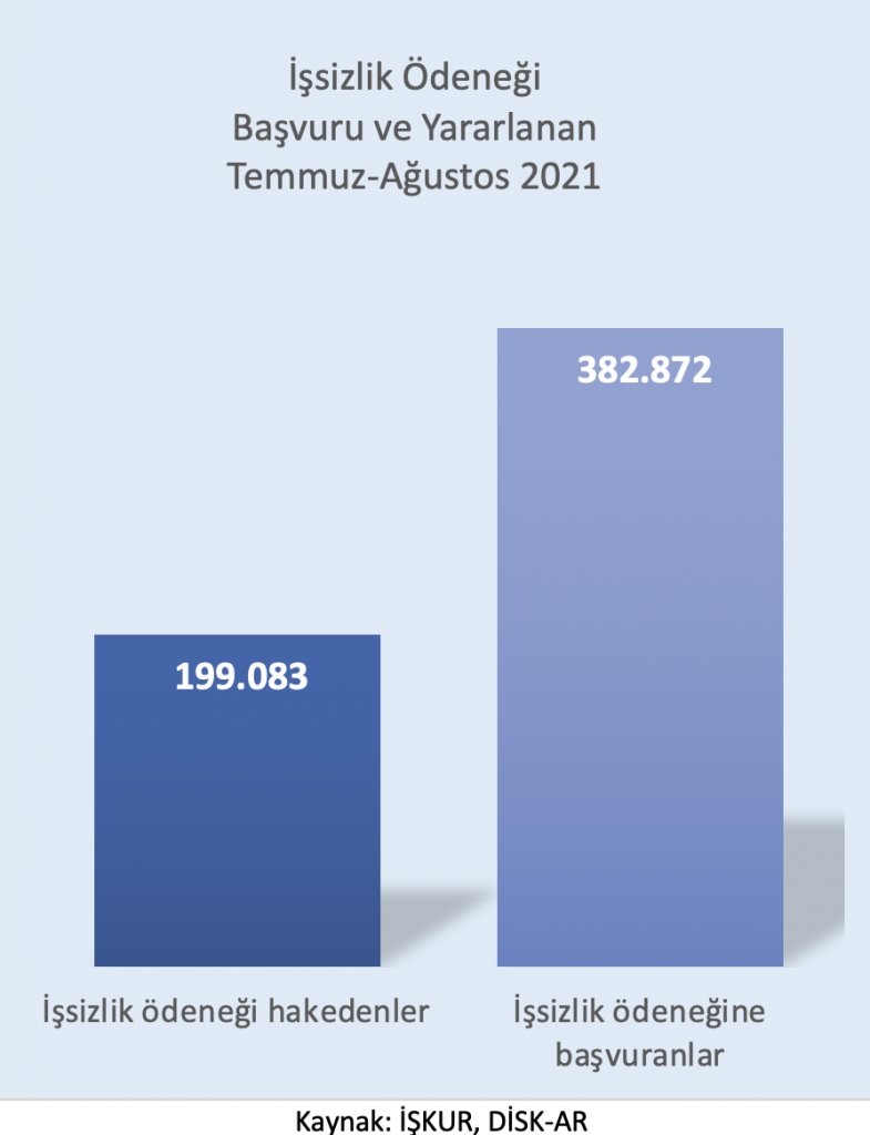 Temmuz ve Ağustos 2021 aylarında işsizlik ödeneğine başvuranların sayısı 383 bine yükseldi. Mayıs ve Haziran 2021 aylarında işsizlik ödeneği başvuranların sayısı 187,5 bindi. Temmuz ve Ağustos 2021 aylarında işsizlik ödeneğine başvuranlardan 199 bin kişiye işsizlik ödeneği bağlandı. Mayıs ve Haziran 2021’de işsizlik ödeneği bağlananların sayısı 47,5 bindi.