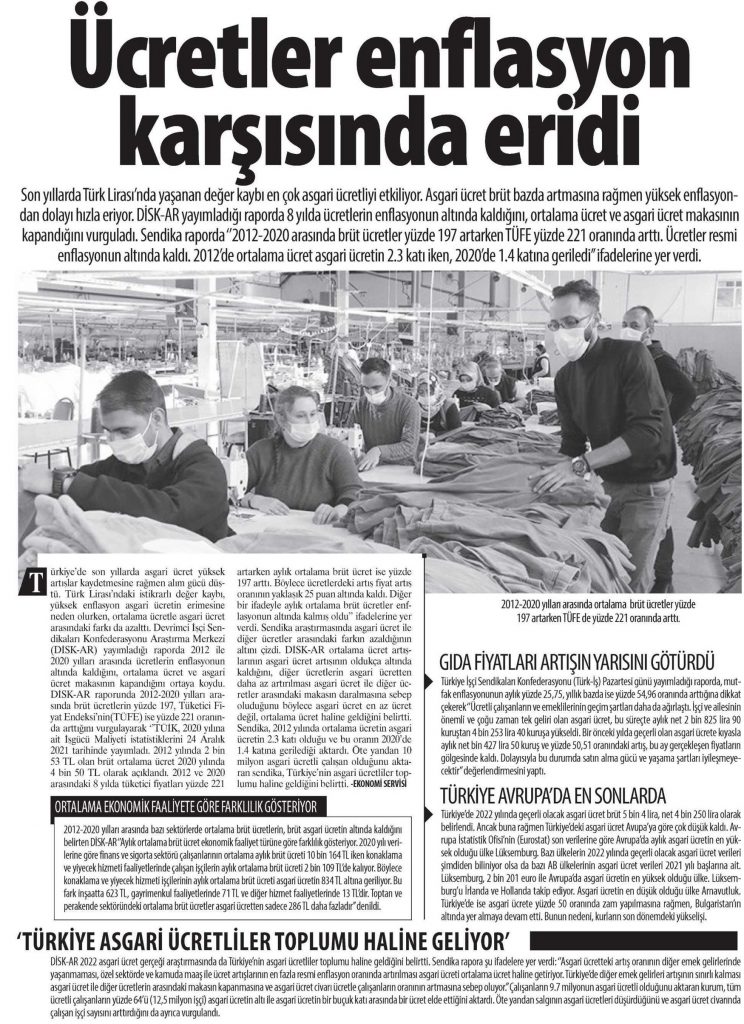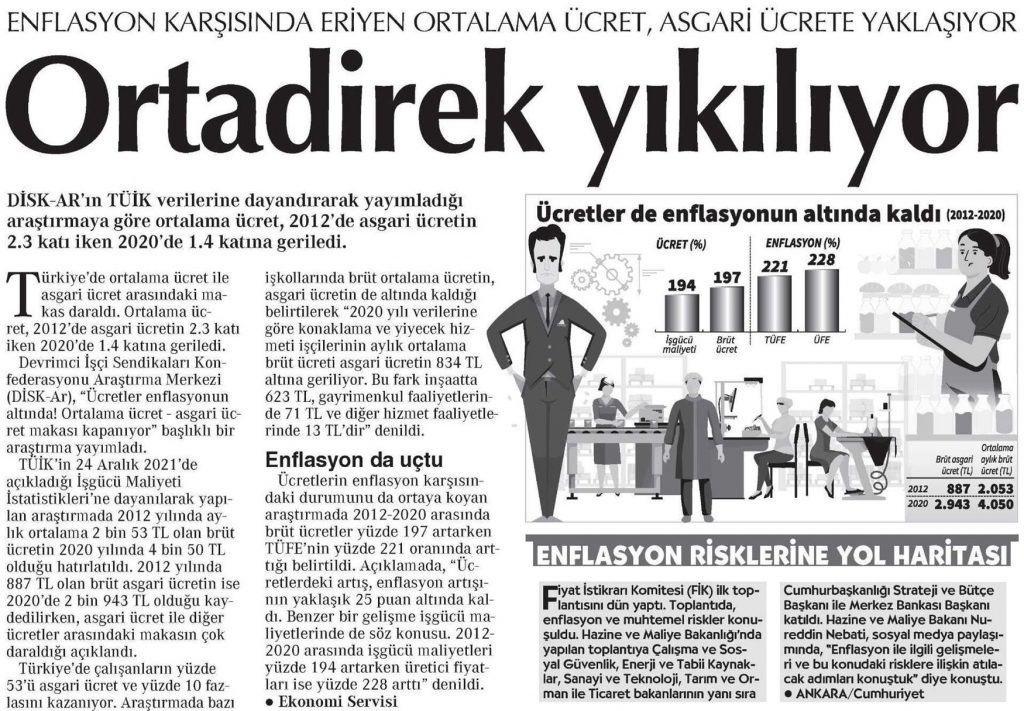 DİSK-AR tarafından hazırlanan ve 28 Aralık 2021’de yayımlanan “Ücretler enflasyonunun altında! Ortalama ücret-asgari ücret makası kapanıyor” isimli araştırma bülteni verilerine 29 Aralık 2021 tarihli Cumhuriyet, Evrensel ve Karar gazetelerinde yer verildi.