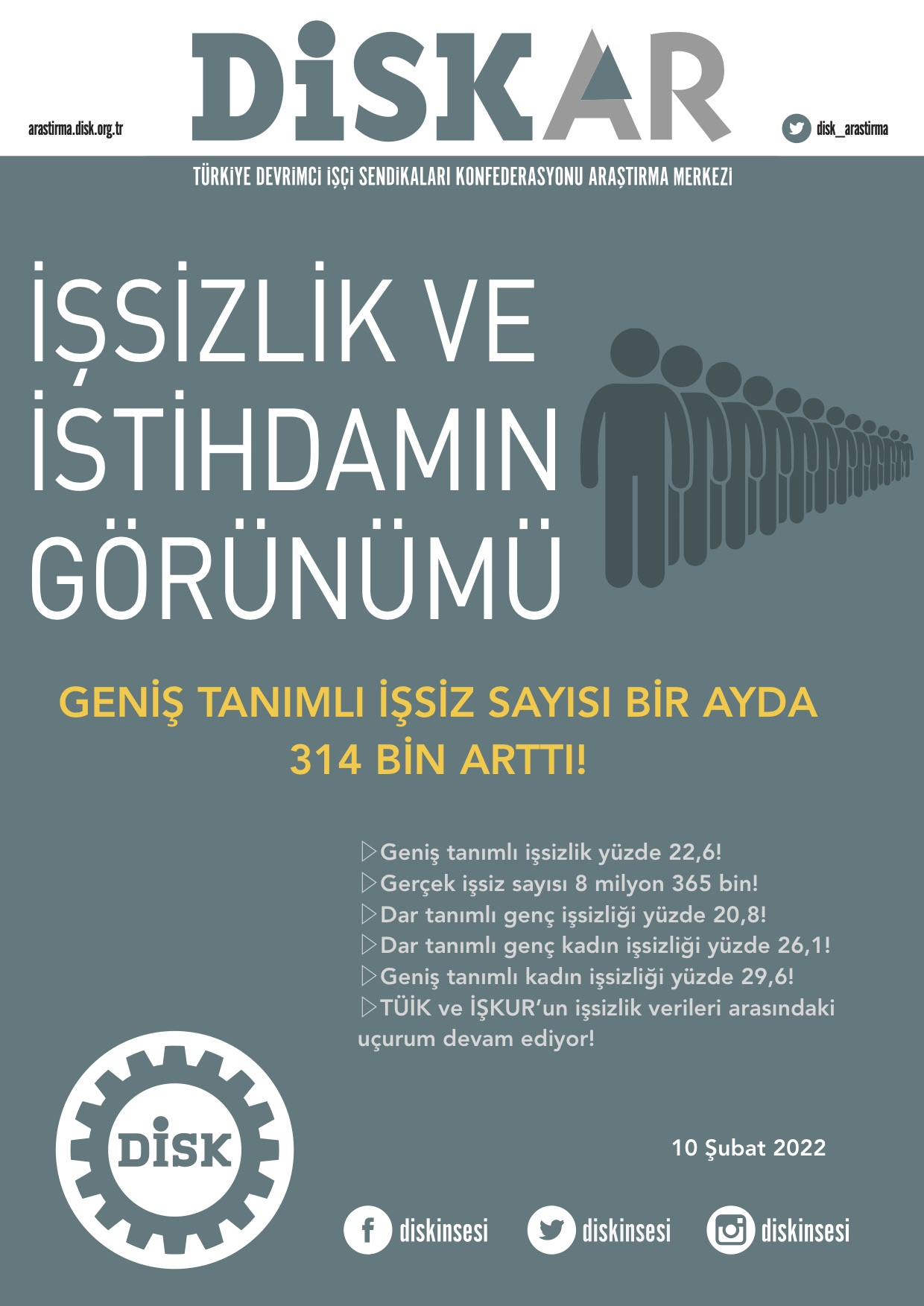 TÜİK’e göre Türkiye genelinde 15 ve daha yukarı yaştaki kişilerde işsiz sayısı (mevsim etkisinden arındırılmış) 2021 Aralık ayında bir önceki aya göre 2 bin kişi artarak 3 milyon 794 bin kişi oldu. DİSK-AR tarafından hesaplamaya göre mevsim etkisinden arındırılmış geniş tanımlı işsiz sayısı ise Aralık 2021’de 8 milyon 365 bin kişi olarak gerçekleşti.