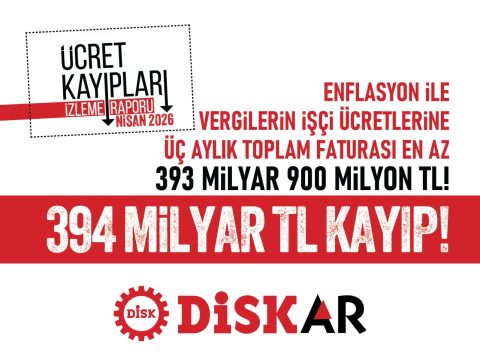 DİSK-AR Ücret Kayıpları İzleme Raporu (Nisan 2026) Yayımlandı! ENFLASYON İLE VERGİLERİN İŞÇİ ÜCRETLERİNE ÜÇ AYLIK TOPLAM FATURASI EN AZ 393 MİLYAR 900 MİLYON TL Yüksek enflasyon ile adaletsiz vergi ve kesintiler işçi ücretlerini eritmeye devam ediyor! Yılın üçüncü ayında enflasyonun sadece...