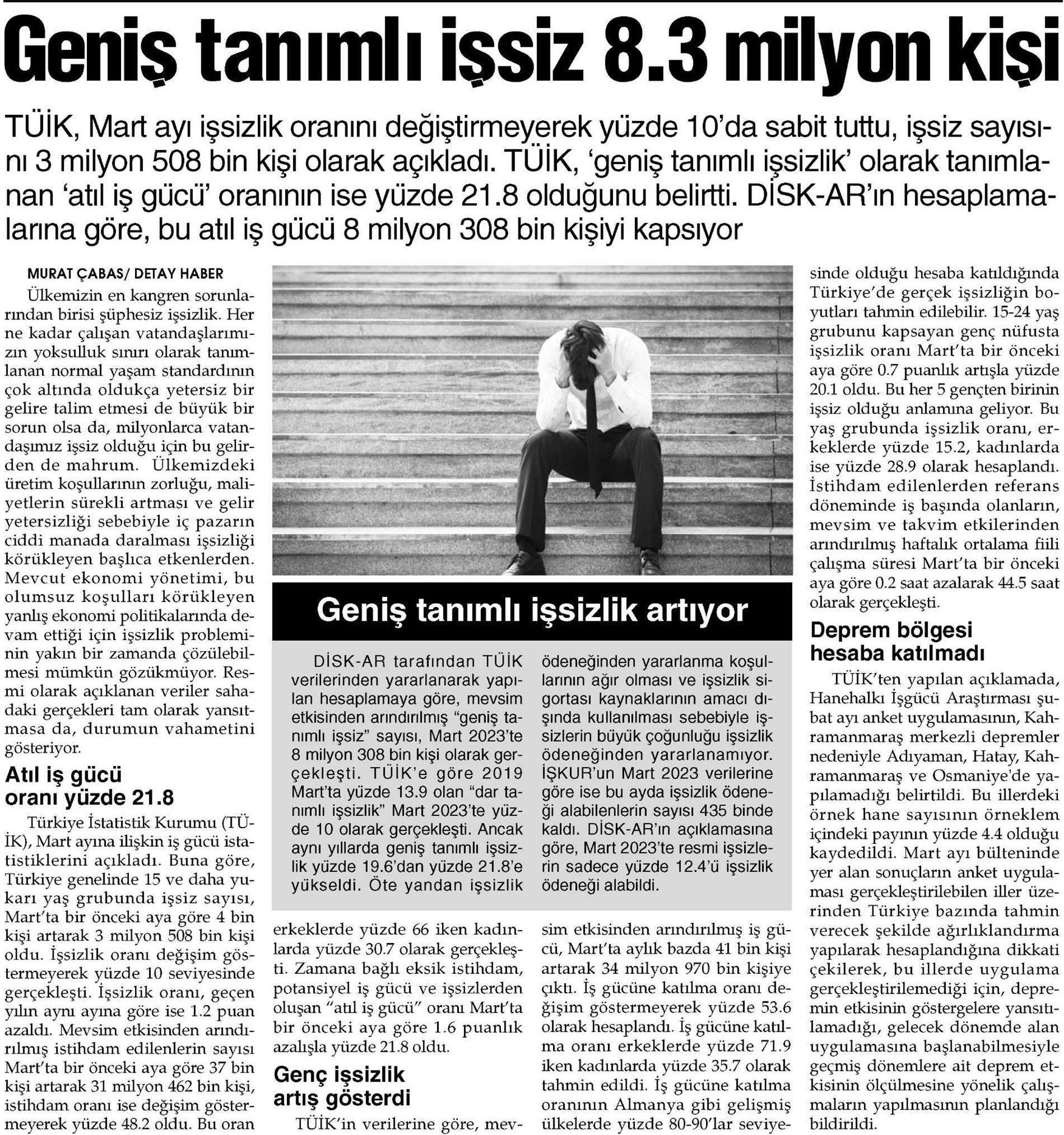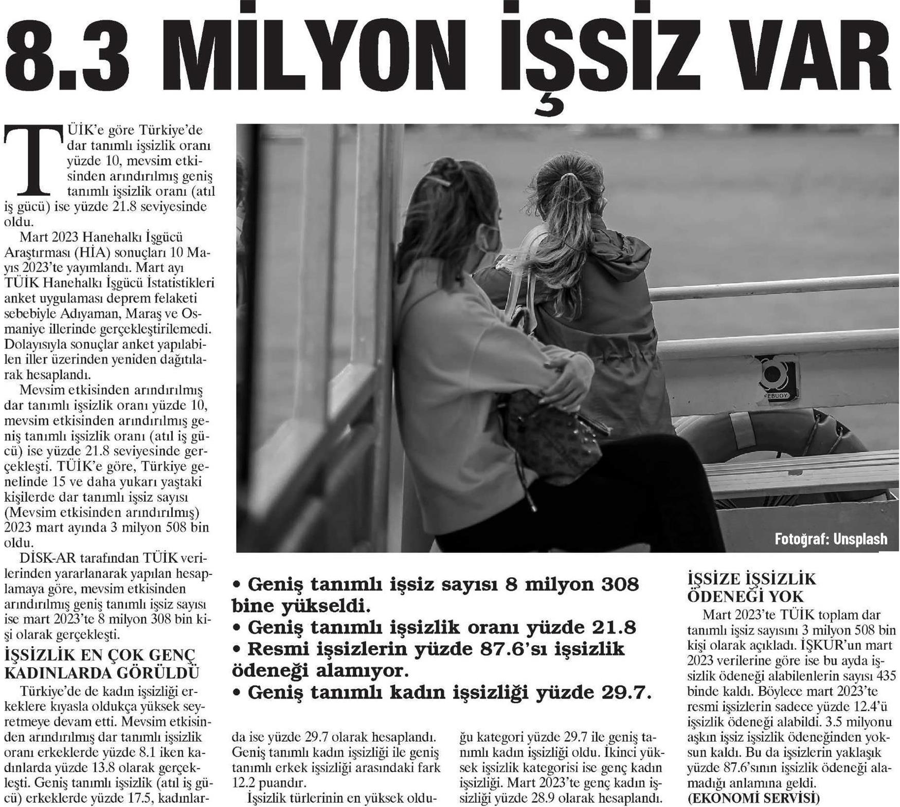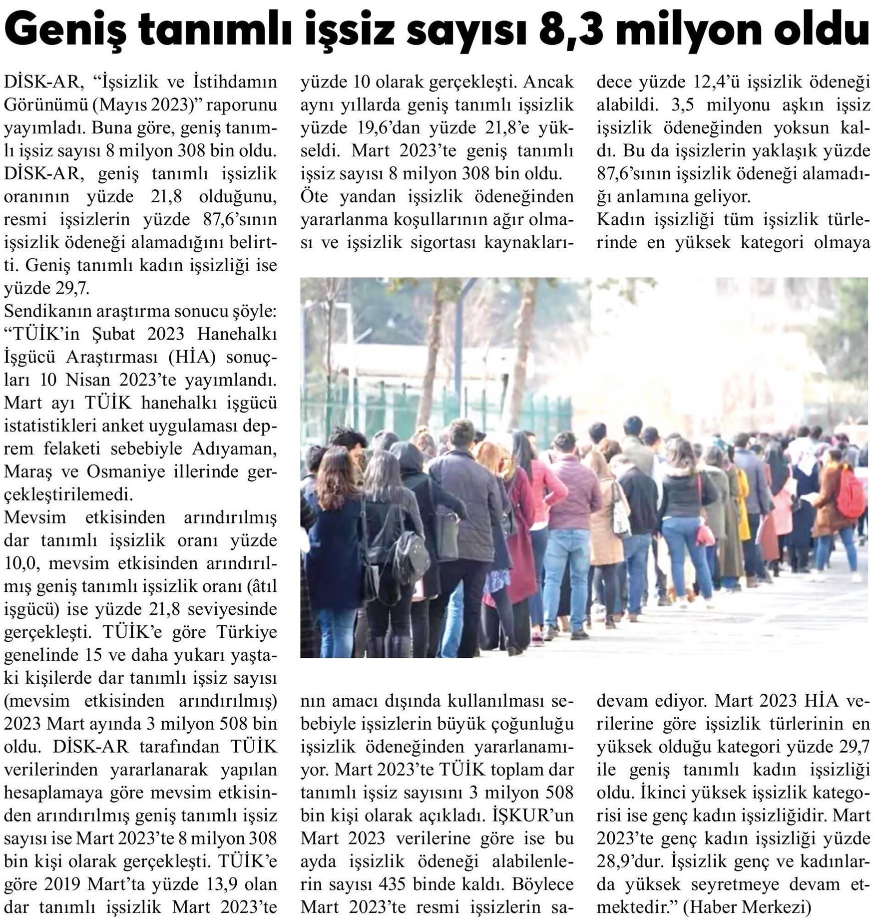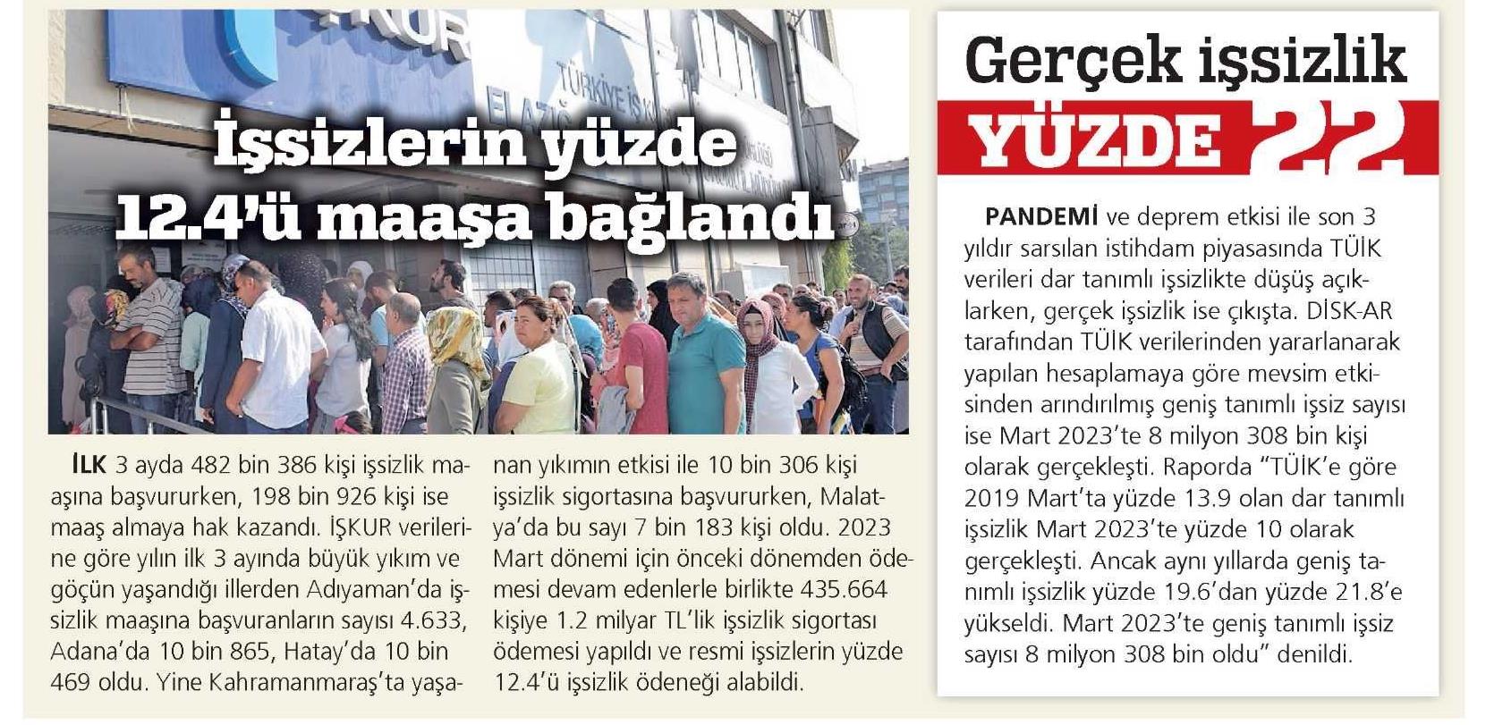 DİSK-AR tarafından hazırlanan ve 10 Mayıs 2023’te yayımlanan “İşsizlik ve İstihdamın Görünümü (Mayıs 2023)” isimli rapor, 11 Mayıs 2023 tarihli yazılı basında yer aldı.