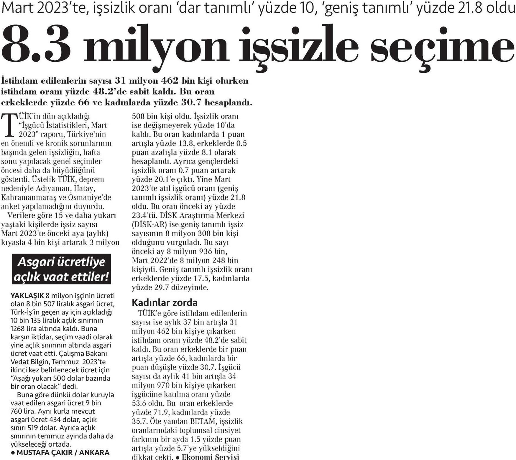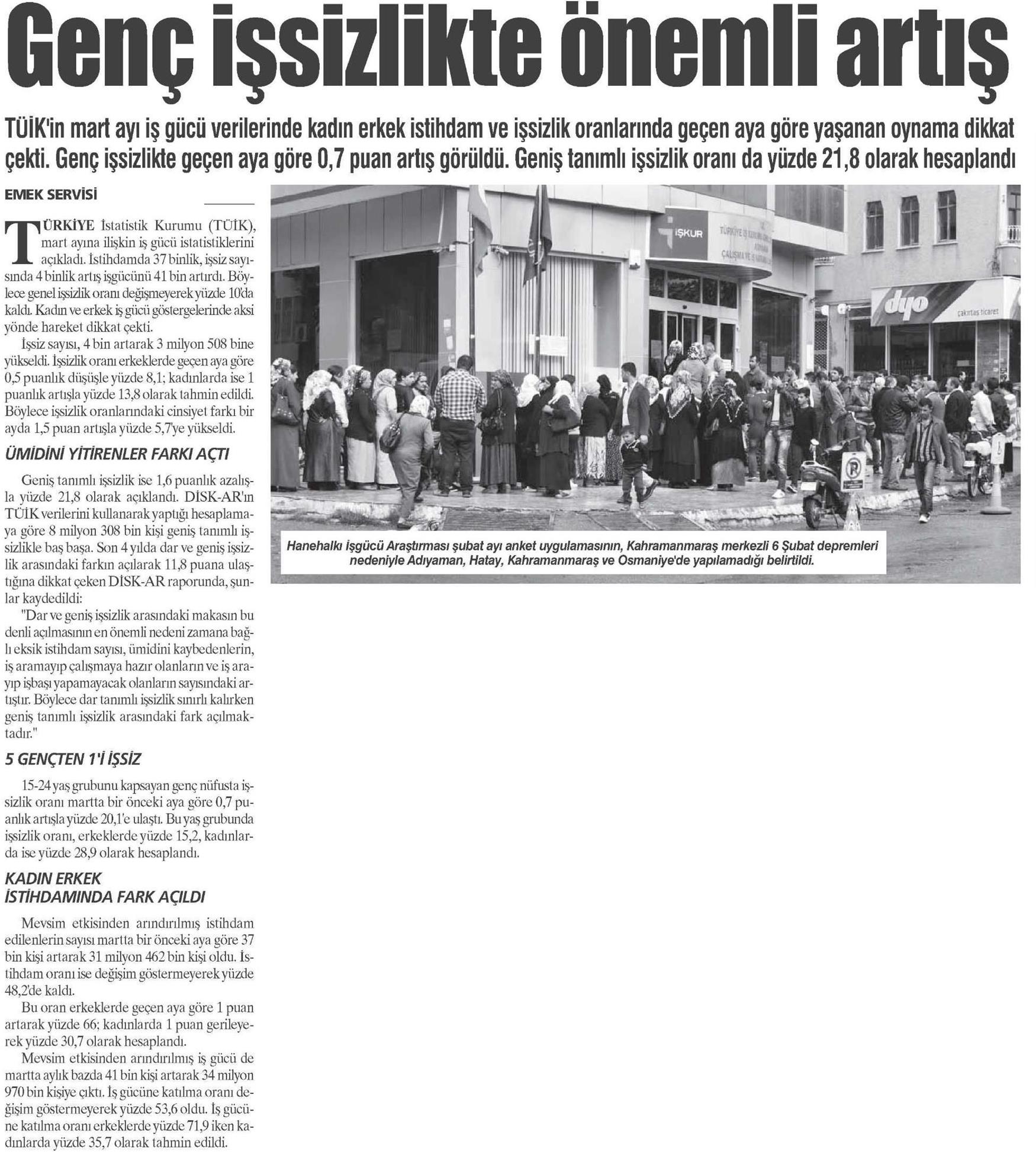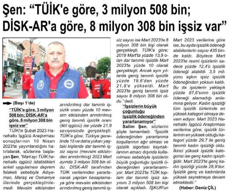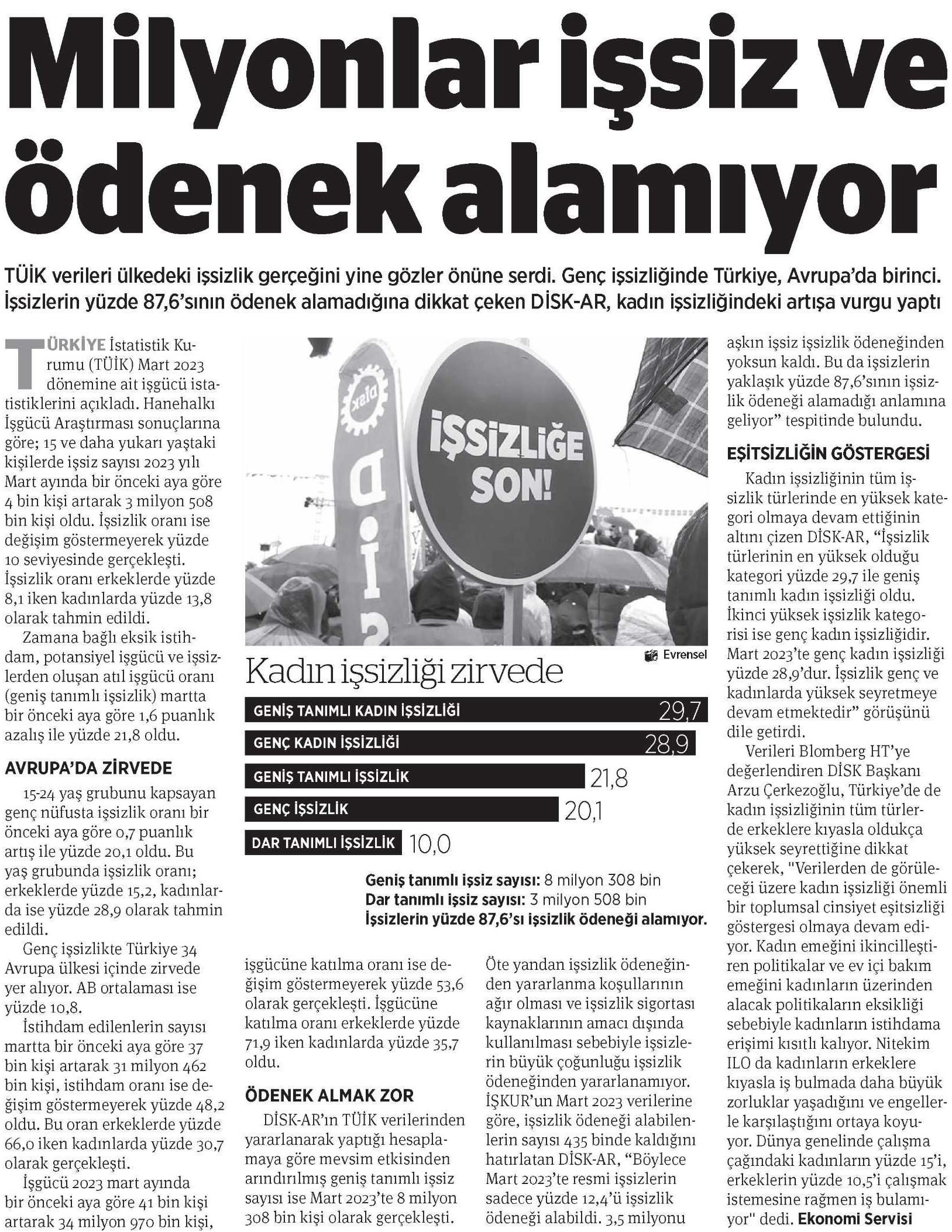 DİSK-AR tarafından hazırlanan ve 10 Mayıs 2023’te yayımlanan “İşsizlik ve İstihdamın Görünümü (Mayıs 2023)” isimli rapor, 11 Mayıs 2023 tarihli yazılı basında yer aldı.