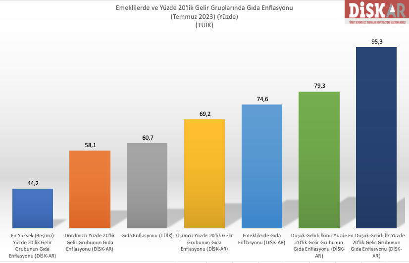 Öte yandan TÜİK tarafından yayımlanan resmi enflasyon oranları farklı gelir gruplarının gerçeğini yansıtmıyor. Resmi ortalama enflasyon oranları düşük gelirlilerin, emekçilerin günlük yaşamda karşılaştığı ve hissettiği oranlar değildir. Bu nedenle DİSK-AR olarak TÜİK’in ham verilerinden yararlanarak emeklilerin, dar gelirlilerin, düşük gelirlilerin hissettiği gıda enflasyonunu yeniden hesaplıyoruz. Yaptığımız hesaplamaya göre gıda enflasyonu ortalama yüzde 60,7 olarak gerçekleşirken emeklilerde gıda enflasyonu yüzde 74,6 oldu. Üçüncü yüzde 20’lik gelir grubunun gıda enflasyonu yüzde 69,2 olurken, düşük gelirli ikinci yüzde 20’lik grubun gıda enflasyonu yüzde 79,3, en yoksul yüzde 20’lik gelir grubun gıda enflasyonu ise yüzde 95,3 olarak gerçekleşti.