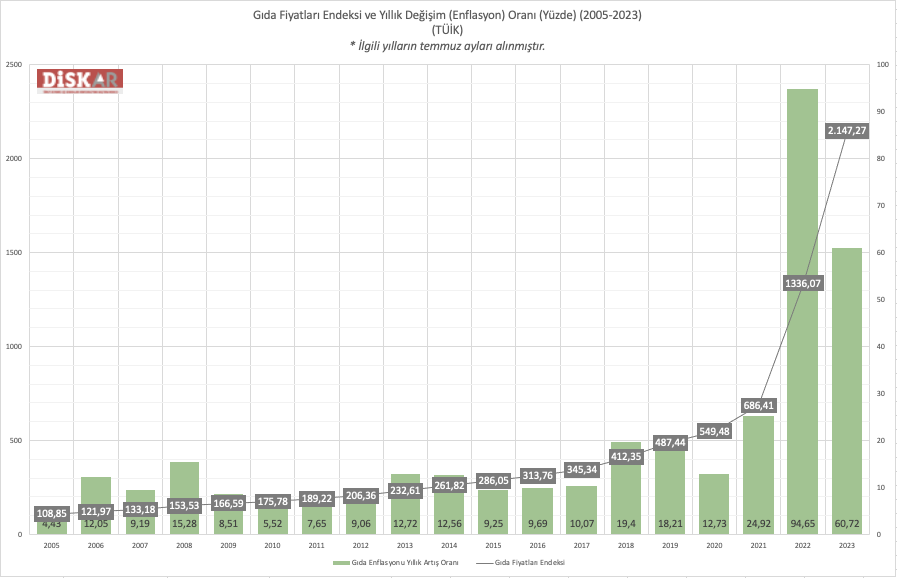Öte yandan son yıllarda gıda enflasyonu ile genel enflasyon arasındaki fark açılmaya başladı. Temmuz 2023’te 2003:100 bazlı TÜFE endeksi 1.479 olurken, gıda enflasyonu endeksi 2.147 oldu.