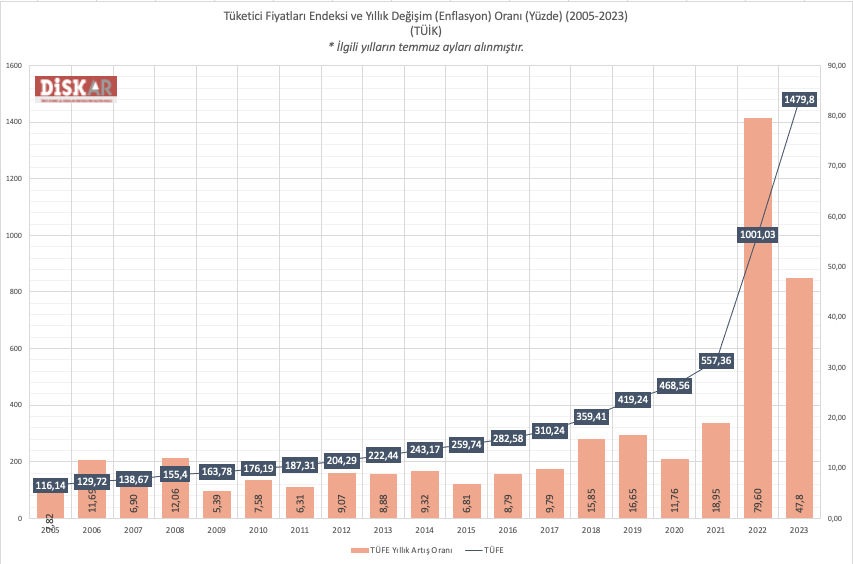 2023 Temmuz dönemine ait Tüketici Fiyat Endeksi (TÜFE) 3 Ağustos 2023 tarihinde yayımlandı. TÜİK verilerine göre TÜFE’deki (2003:100) değişim 2023 Temmuz’da bir önceki aya göre yüzde 9,49, bir önceki yılın aralık ayına göre yüzde 31,14, on iki aylık ortalamalara göre yüzde 57,45, bir önceki yılın aynı ayına göre yüzde 47,8 olarak gerçekleşti. Böylece resmi enflasyon yeniden tırmanmaya başladı. Tüketici fiyat endeksi (TÜFE) yıllık %47,83, aylık %9,49 oldu! Böylece AKP döneminde en yüksek temmuz ayı enflasyonu görülmüş oldu.