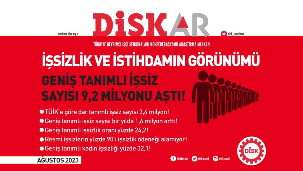 DİSK-AR tarafından TÜİK verilerinden yararlanarak yapılan hesaplamaya göre mevsim etkisinden arındırılmış geniş tanımlı işsiz sayısı ise Haziran 2023’te 9 milyon 234 bin kişi olarak gerçekleşti. TÜİK’e göre pandemi öncesinde, 2019 Haziran’da yüzde 13,7 olan dar tanımlı işsizlik Haziran 2023’te yüzde 9,6 olarak gerçekleşti. Ancak aynı yıllarda geniş tanımlı işsizlik yüzde 19,1’den yüzde 24,2’ye yükseldi. Böylece Covid-19 pandemisi sonrası geniş tanımlı işsizlik oranı 5,1 puan, geniş tanımlı işsiz sayısı ise 5 milyon 897 bin kişi arttı.