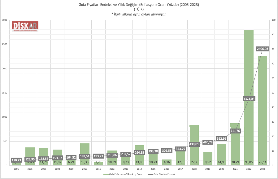 TÜİK, Eylül 2023 döneminde gıda enflasyonunu yüzde 75,14 olarak açıkladı. Ancak bu enflasyon halkın hissettiği gerçek enflasyonu yansıtmaktan oldukça uzak bir oran. TÜİK, DİSK tarafından açılan ve kazanılan davaya rağmen yargı kararını uygulamıyor ve madde fiyat listesini açıklamıyor. Madde fiyatları halen karartılmış durumda. Bu nedenle enflasyon oranını hesaplanmasına kaynak teşkil eden madde fiyat listesi görülemiyor.