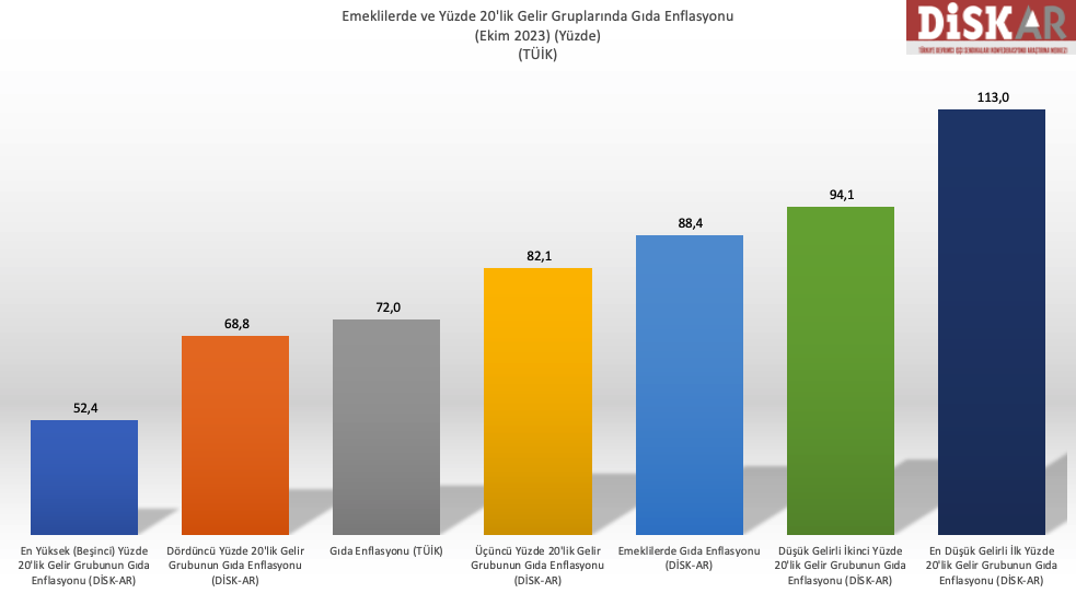 Resmi ortalama enflasyon oranları düşük gelirlilerin, emekçilerin günlük yaşamda karşılaştığı ve hissettiği oranlar değildir. Bu nedenle DİSK-AR olarak TÜİK’in ham verilerinden yararlanarak emeklilerin, dar gelirlilerin, düşük gelirlilerin hissettiği gıda enflasyonunu yeniden hesaplıyoruz. Yaptığımız hesaplamaya göre gıda enflasyonu ortalama yüzde 72 olarak gerçekleşirken emeklilerde gıda enflasyonu yüzde 88,4 oldu. Üçüncü yüzde 20’lik gelir grubunun gıda enflasyonu yüzde 82,1 olurken, düşük gelirli ikinci yüzde 20’lik grubun gıda enflasyonu yüzde 94,1 ve en yoksul yüzde 20’lik gelir grubun gıda enflasyonu ise yüzde 113 olarak gerçekleşti.