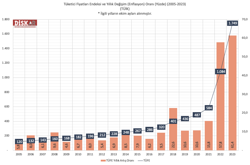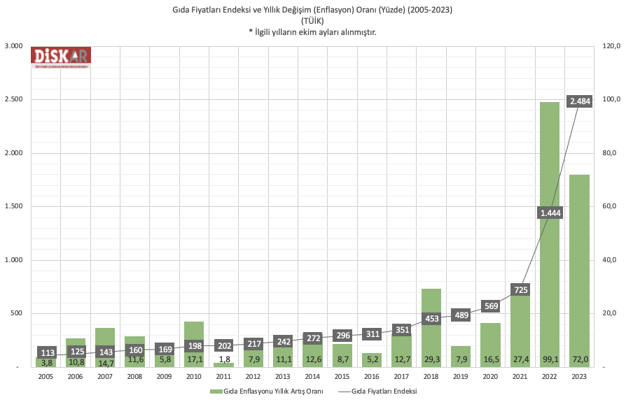 TÜFE ve gıda fiyatları endeksi artmaya devam ediyor. 2005 yılında 120 olan TÜFE endeksi, Ekim 2023’te 1.749’a yükseldi. 2005’te 113 olan gıda fiyatları endeksi ise 2023’te 2.484’e yükseldi. Böylece TÜFE 2003’ten bu yana 17,5 ve 2005’ten bu yanda 14,6 kat; gıda fiyatları ise 2003’ten bu yana 25 kat ve 2005’ten bu yana 22 kat arttı. 2005’te yüzde 5,8 olan yıllık enflasyon oranı 2023’te yüzde 61,4 oldu. 2005’te yüzde 3,8 olan yıllık gıda enflasyonu ise 2023’te yüzde 72’ye yükseldi.