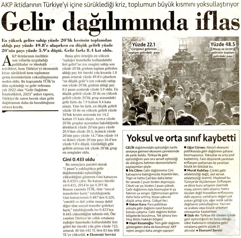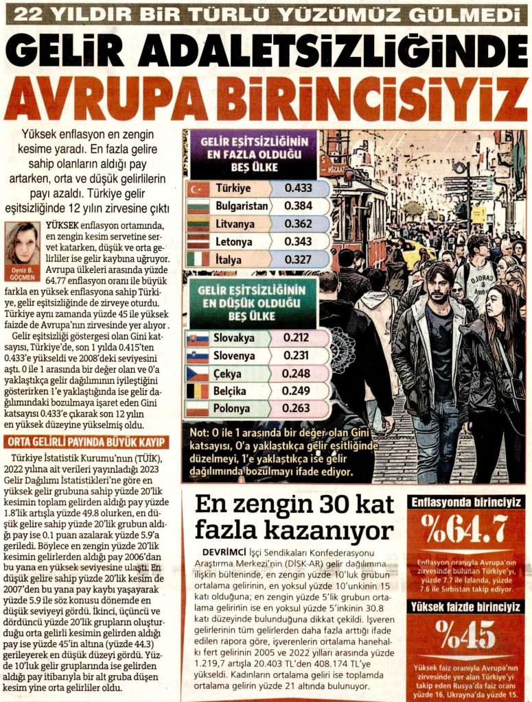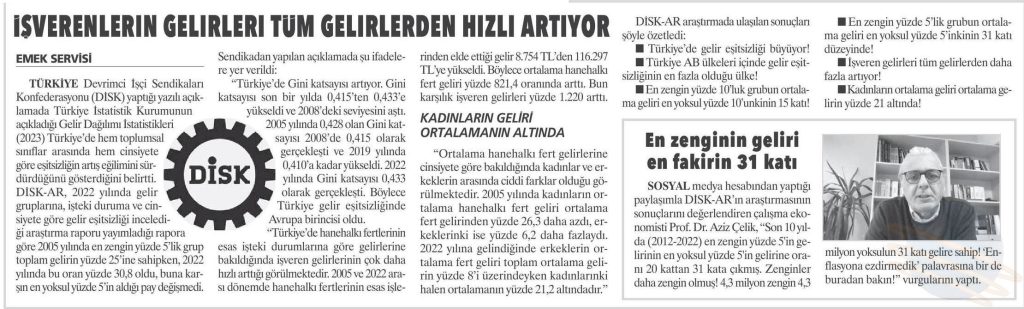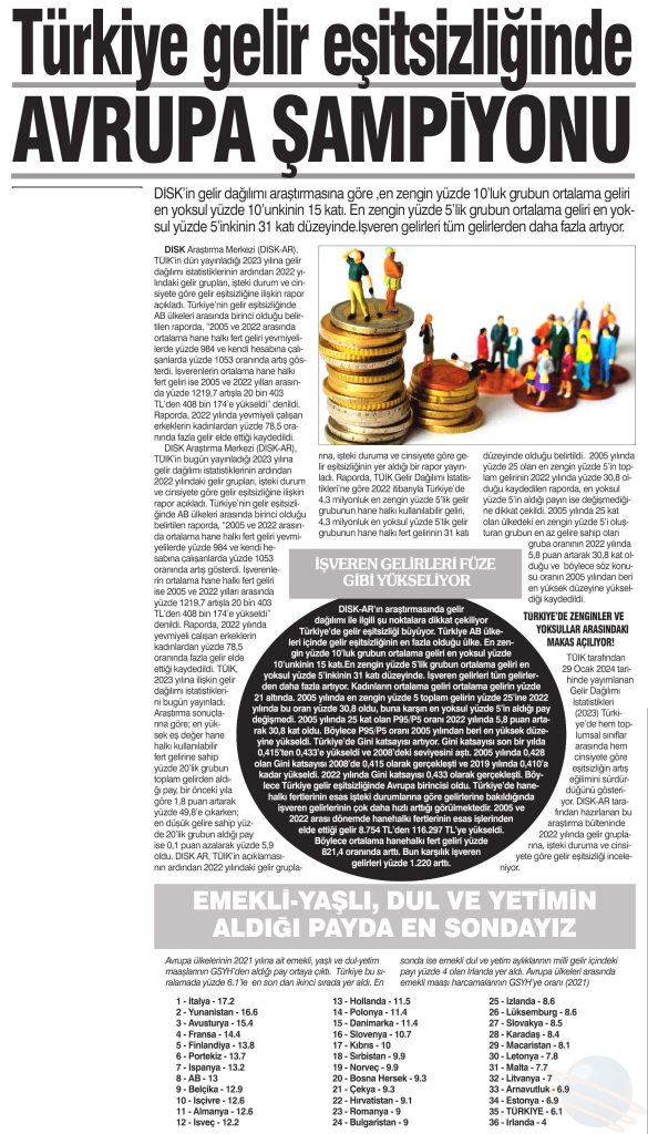 DİSK-AR tarafından hazırlanan ve 29 Ocak 2024 tarihinde yayımlanan “Gelir Dağılımında Vahim Bozulma” isimli araştırma bülteni 30 Ocak 2024 tarihli yazılı basında yer aldı.