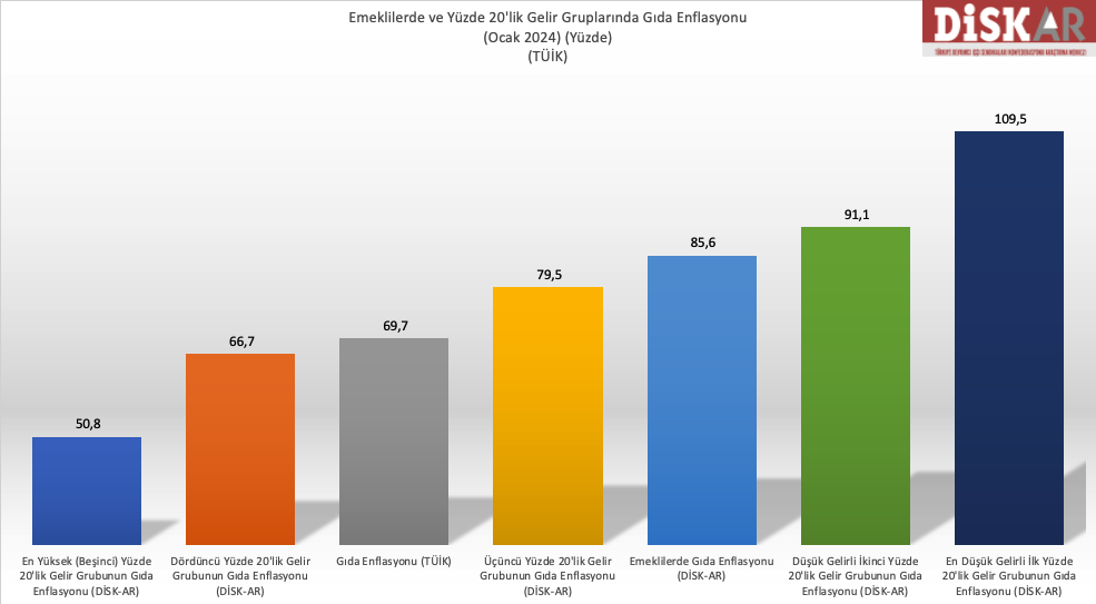 DİSK-AR olarak TÜİK verilerinden yararlanarak yaptığımız hesaplamaya göre gıda enflasyonu ortalama yüzde 69,7 olarak gerçekleşirken emeklilerde gıda enflasyonu yüzde 85,6 oldu. Üçüncü yüzde 20’lik gelir grubunun gıda enflasyonu yüzde 79,5 olurken, düşük gelirli ikinci yüzde 20’lik grubun gıda enflasyonu yüzde 91,1 ve en yoksul yüzde 20’lik gelir grubun gıda enflasyonu ise yüzde 109,5 olarak gerçekleşti.