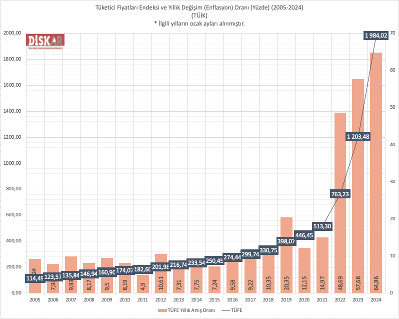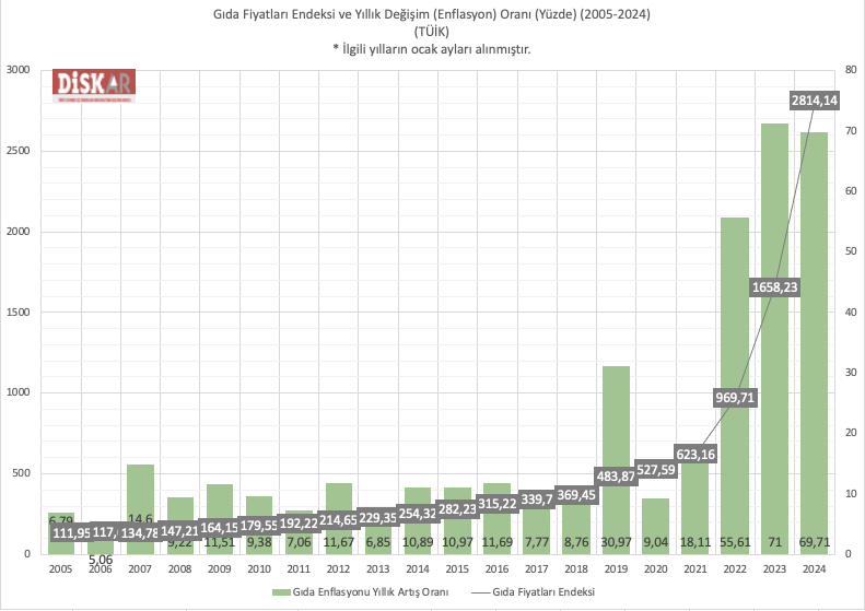 TÜFE ve gıda fiyatları endeksi artmaya devam ediyor. 2005 yılında 114,49 olan TÜFE endeksi, Ocak 2024’te 1.984,02’ye yükseldi. 2005’te 111,95 olan gıda fiyatları endeksi ise 2024’te 2.814,14’e yükseldi. Böylece TÜFE 2005’ten bu yanda 17 kat; gıda fiyatları ise 2005’ten bu yana 25 kat arttı. 2005’te yüzde 9,24 olan yıllık enflasyon oranı 2024’te yüzde 64,86 oldu. 2005’te yüzde 6,79 olan yıllık gıda enflasyonu ise 2023’te yüzde 69,71’e yükseldi.