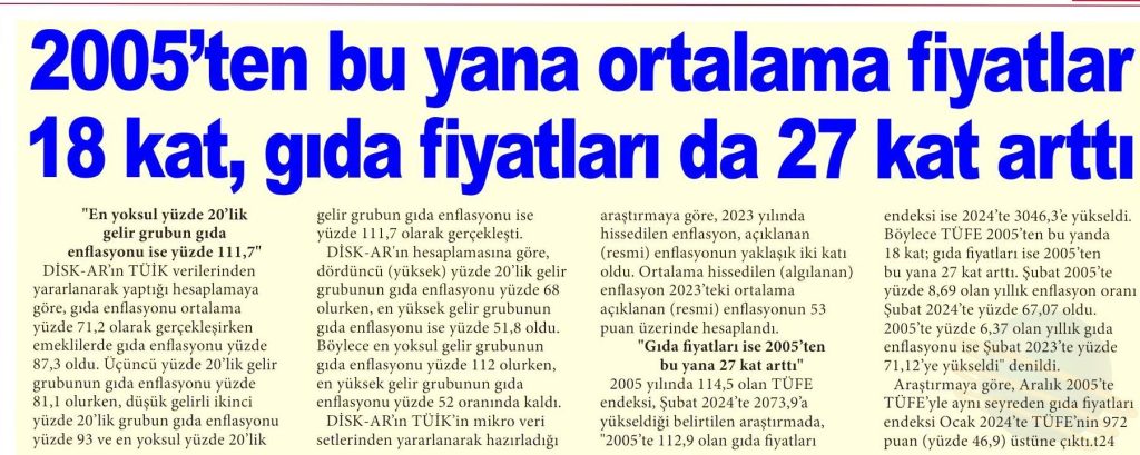 DİSK-AR tarafından hazırlanan ve 4 Mart 2024 tarihinde yayımlanan “Gıda enflasyonu resmi enflasyonu katladı” isimli araştırma bülteni, 5 Mart 2024 tarihli yazılı basında yer aldı.