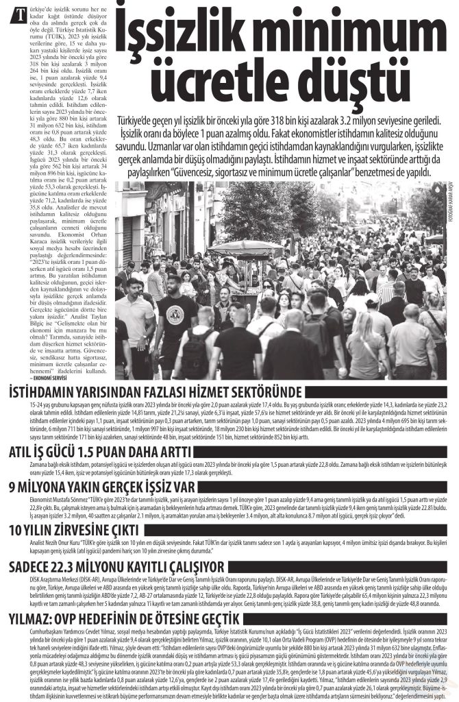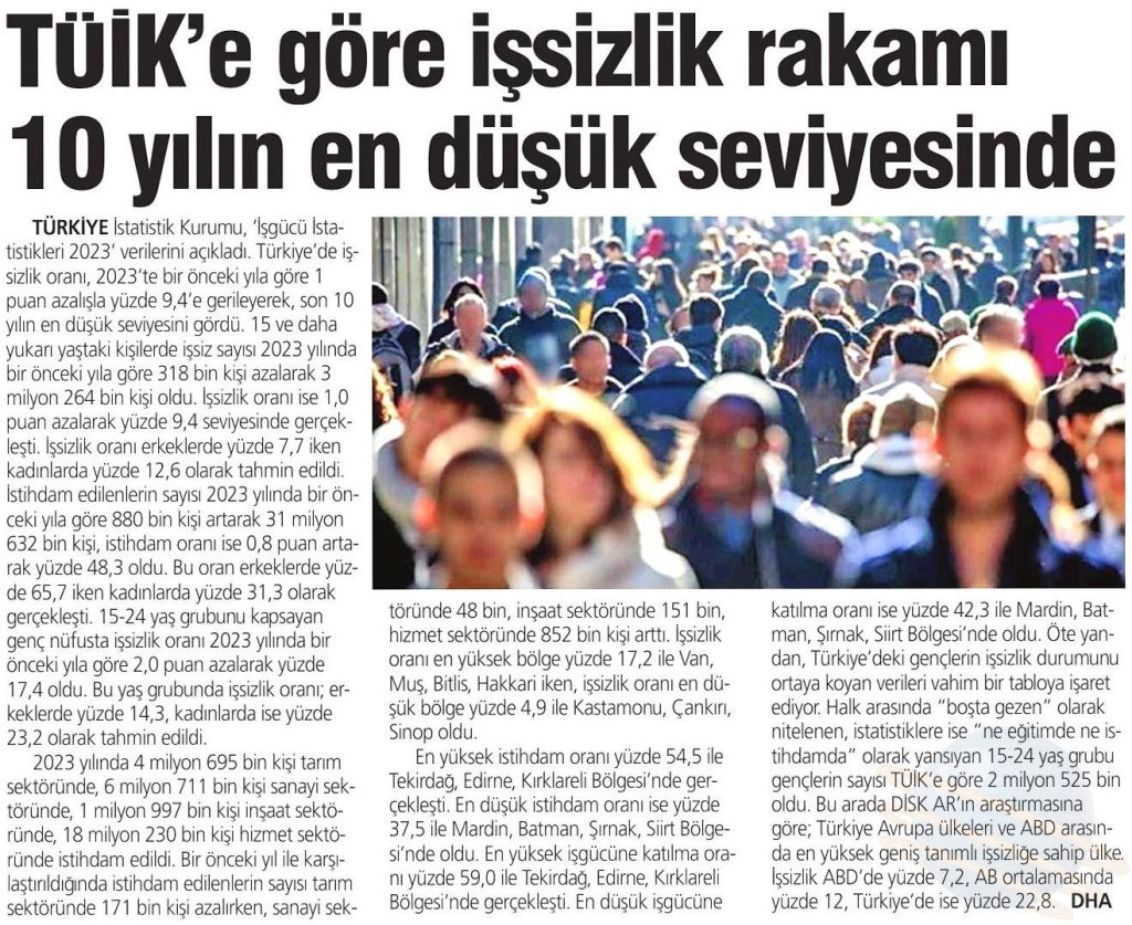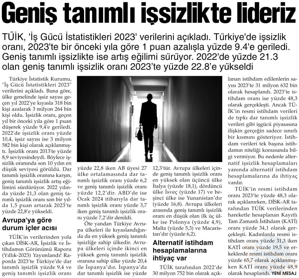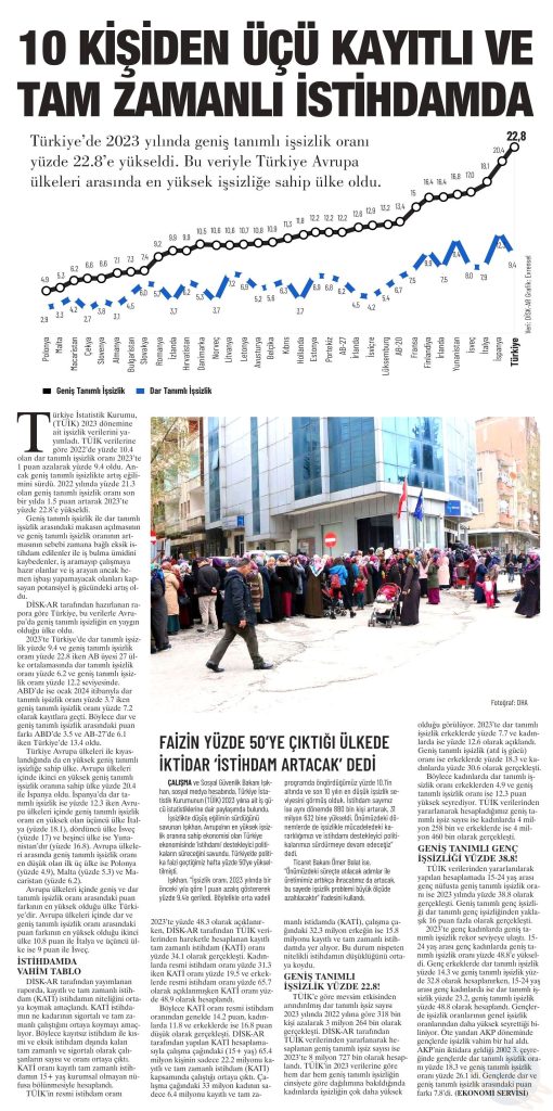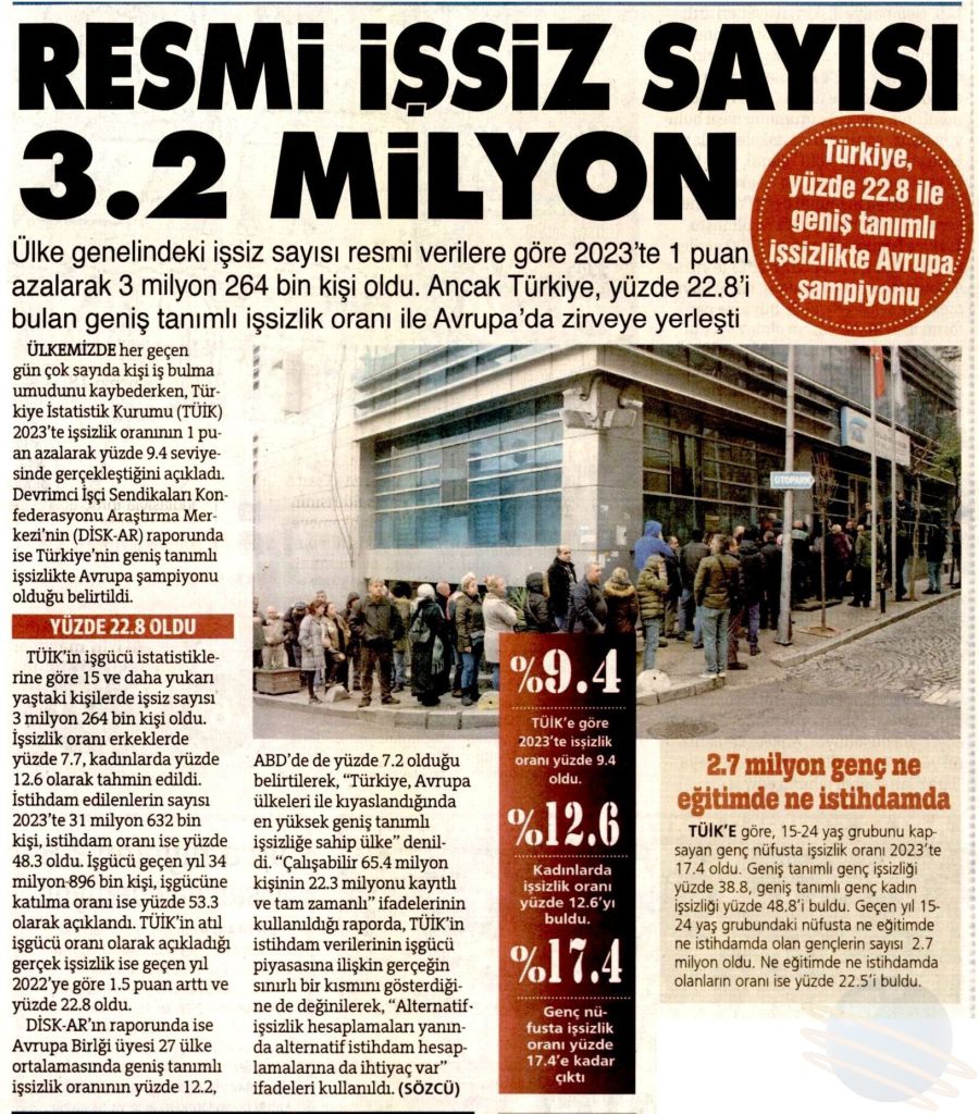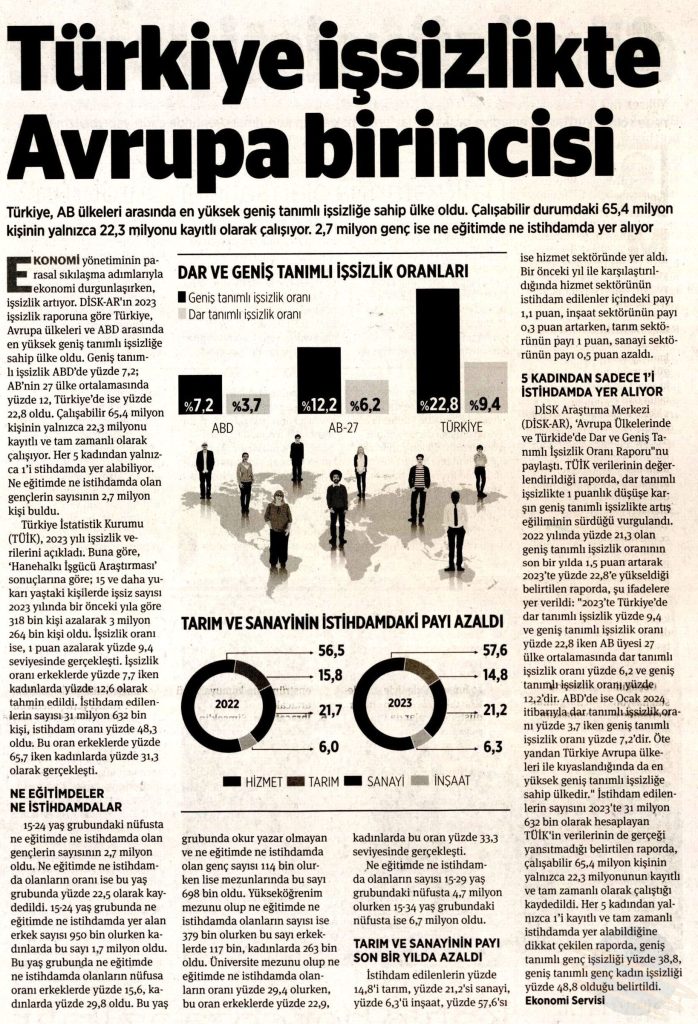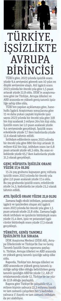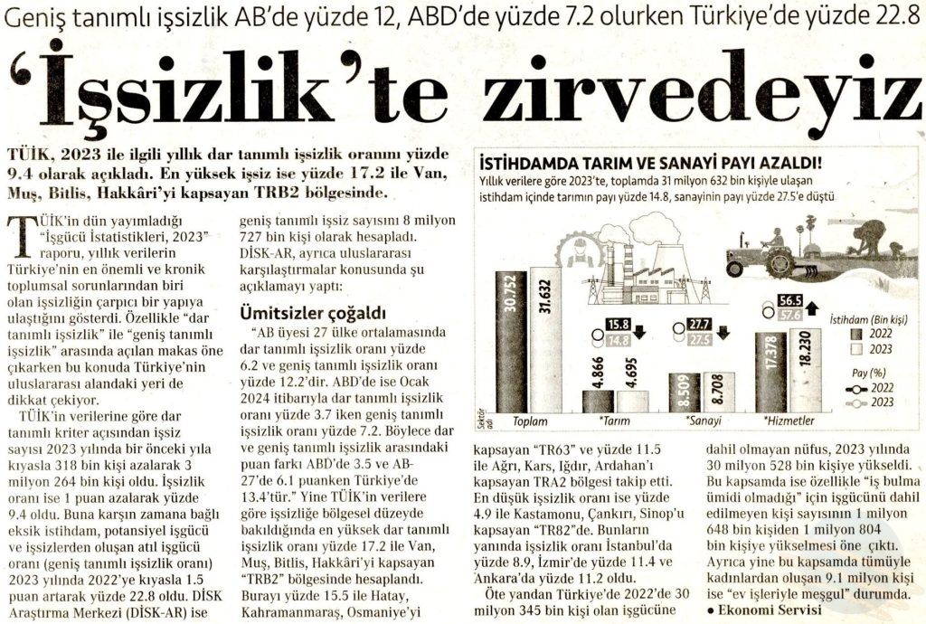 DİSK-AR “İşsizlik ve İstihdamın Görünümü (Yıllık-2023)” isimli raporun basına yansımaları 26 Mart 2024 DİSK-AR tarafından hazırlanan ve 25 Mart 2024’te yayımlanan “İşsizlik ve İstihdamın Görünümü Raporu (Yıllık- 2023)“, 26 Mart 2024 tarihli yazılı basında geniş yer aldı. BirGün, 26 Mart 2024 Cumhuriyet, 26 Mart 2024 Sözcü, 26 Mart 2024 Evrensel, 26 Mart 2024 Günboyu, 26 Mart 2024 Karar, 26 Mart 2024 Gazete Pencere, 26 Mart 2024 Yeniçağ, 26 Mart 2024 Yeni Mesaj, 26 Mart 2024
