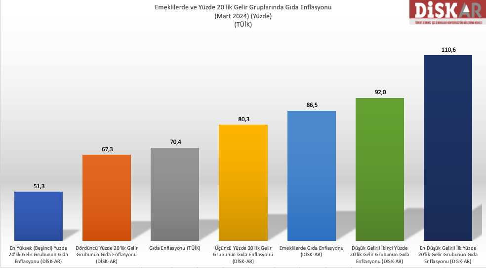 TÜİK, Mart 2024 döneminde gıda enflasyonunu yüzde 70,41 olarak açıkladı. Ancak bu enflasyon halkın hissettiği gerçek enflasyonu yansıtmaktan oldukça uzak bir oran. DİSK-AR’ın TÜİK verilerinden yararlanarak yaptığı hesaplamaya göre gıda enflasyonu ortalama yüzde 70,4 olarak gerçekleşirken emeklilerde gıda enflasyonu yüzde 86,5 oldu. Üçüncü yüzde 20’lik gelir grubunun gıda enflasyonu yüzde 80,3 olurken, düşük gelirli ikinci yüzde 20’lik grubun gıda enflasyonu yüzde 92 ve en yoksul yüzde 20’lik gelir grubun gıda enflasyonu ise yüzde 110,6 olarak gerçekleşti.