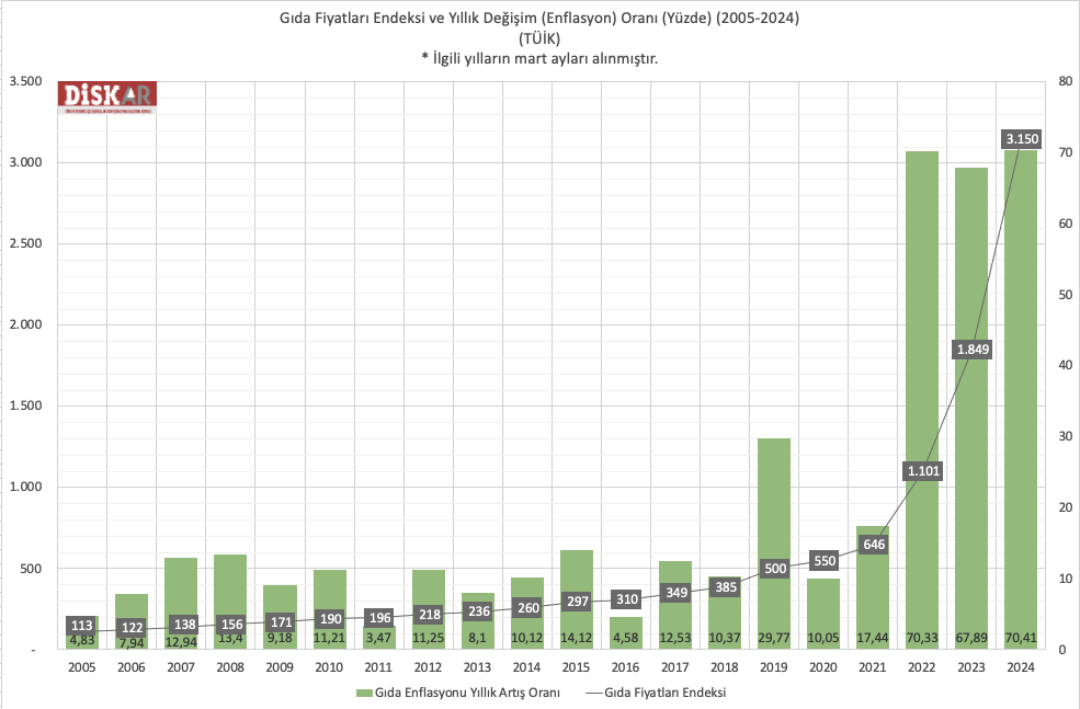 Öte yandan son yıllarda gıda enflasyonu ile genel enflasyon arasındaki fark açılmaya başladı. Mart 2005’te TÜFE’yle aynı seyreden gıda fiyatları endeksi Mart 2024’te TÜFE’nin 1.011 puan (yüzde 47,3) üstüne çıktı.