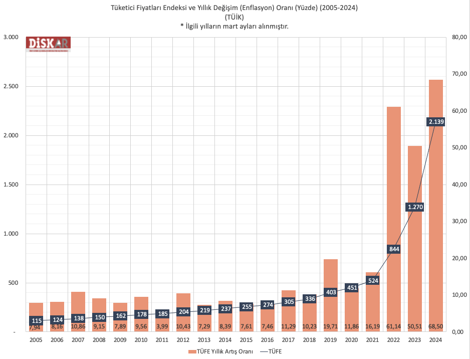 2024 Mart dönemine ait TÜİK Tüketici Fiyat Endeksi (TÜFE) 3 Nisan 2024’te yayımlandı. TÜİK verilerine göre TÜFE’deki (2003:100) değişim 2024 Mart’ta bir önceki aya göre yüzde 3,16, on iki aylık ortalamalara göre yüzde 57,50 ve bir önceki yılın aynı ayına göre yüzde 68,50 oldu. 2024 yılının ilk üç ayında ortalama fiyat artış oranı ise yüzde 15,06 olarak gerçekleşti. 2024 Mart döneminde en yüksek fiyat artışı yıllık yüzde 104,07 ile eğitim oldu. İkinci en yüksek fiyat artışının görüldüğü harcama grubu yıllık yüzde 97,94 artışla lokanta ve oteller olurken üçüncü harcama grubu ise yüzde 80,25 ile sağlık oldu.