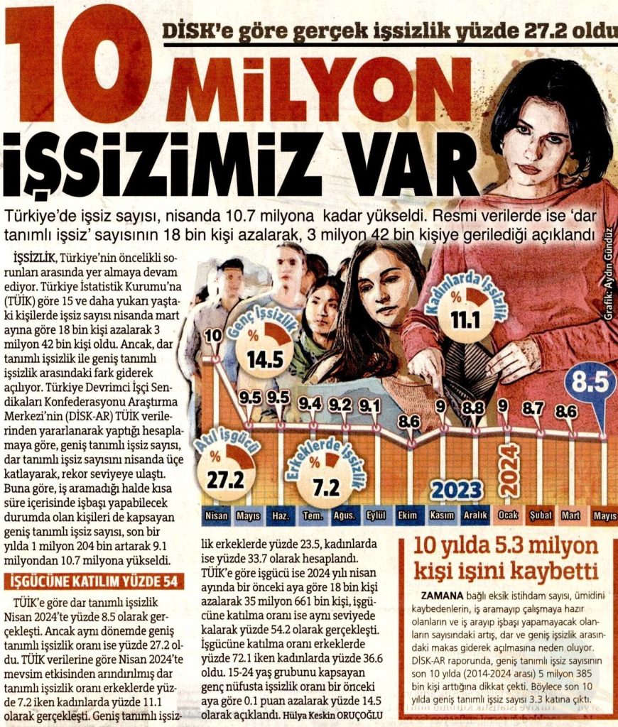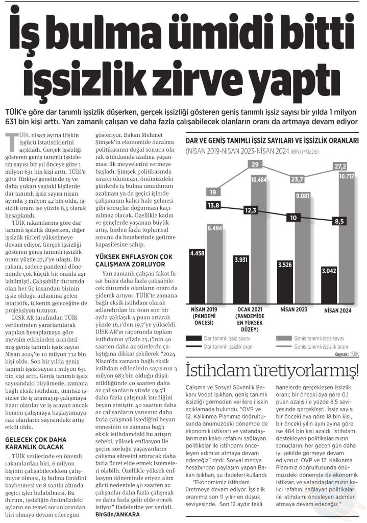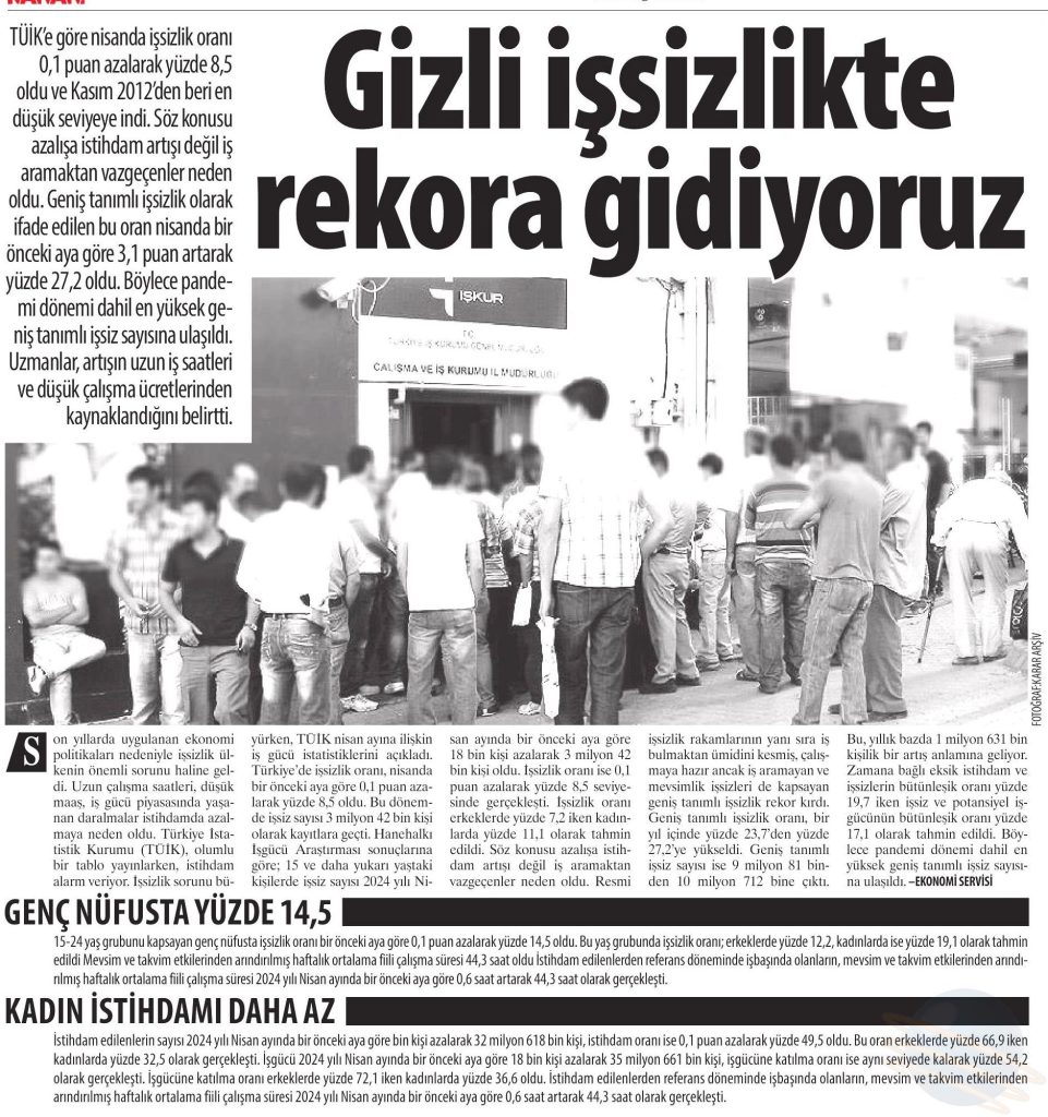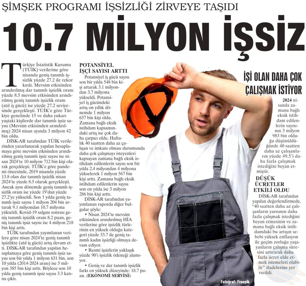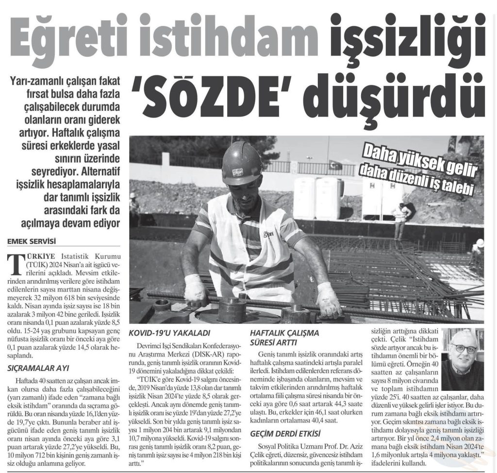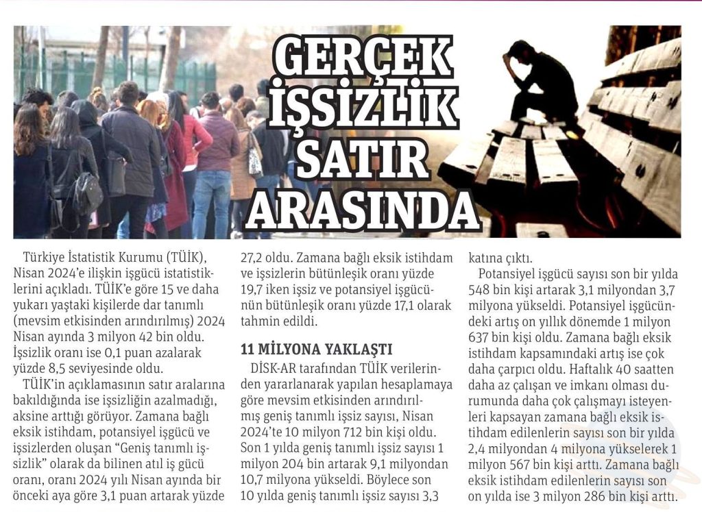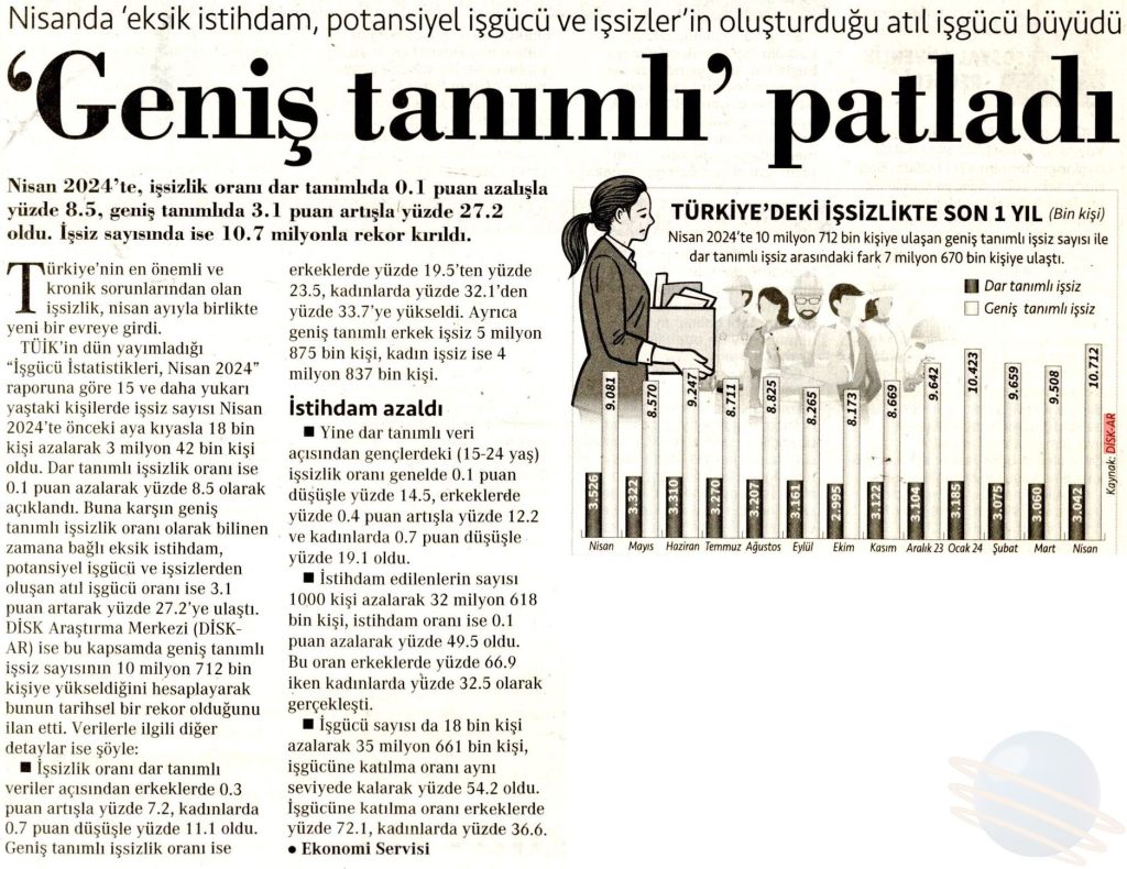 DİSK-AR tarafından hazırlanan ve 10 Haziran 2024’te yayımlanan “İşsizlik ve İstihdamın Görünümü Raporu (Haziran-2024)” 11 Haziran 2024 tarihli yazılı basında geniş yer aldı.