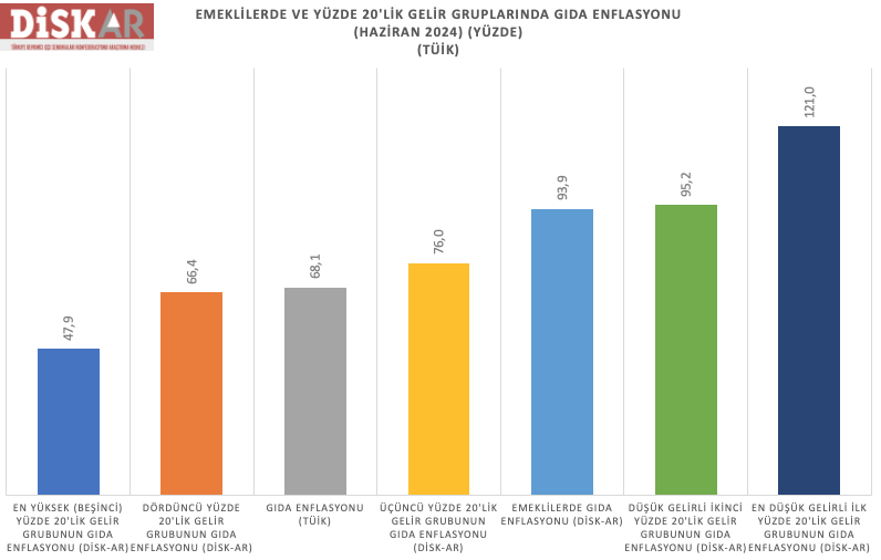 TÜİK, Haziran 2024 döneminde gıda enflasyonunu yüzde 68,08 olarak açıkladı. Ancak bu enflasyon halkın hissettiği gerçek enflasyonu yansıtmaktan oldukça uzak bir oran. DİSK-AR’ın TÜİK verilerinden yararlanarak yaptığı hesaplamaya göre emeklilerde gıda enflasyonu yüzde 93,9 oldu. Üçüncü yüzde 20’lik gelir grubunun gıda enflasyonu yüzde 76 olurken, düşük gelirli ikinci yüzde 20’lik grubun gıda enflasyonu yüzde 95,2 ve en yoksul yüzde 20’lik gelir grubun gıda enflasyonu ise yüzde 121 olarak gerçekleşti.