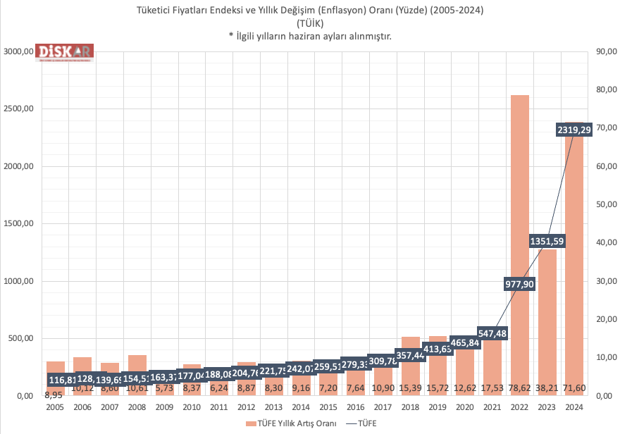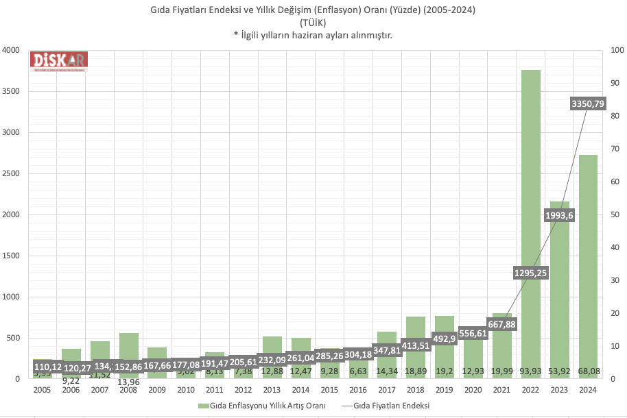 TÜFE ve gıda fiyatları endeksi artmaya devam ediyor. 2005 Haziran’da 116 olan TÜFE endeksi, Haziran 2024’te 2.319’a yükseldi. 2005 Haziran’da 110 olan gıda fiyatları endeksi ise 2024 Mayıs’ta 3.350’ye yükseldi. Haziran 2005’te yüzde 8,9 olan yıllık enflasyon oranı Haziran 2024’te yüzde 71,6 oldu. 2005’te yüzde 3,9 olan yıllık gıda enflasyonu ise Haziran 2024’te yüzde 68’e yükseldi.