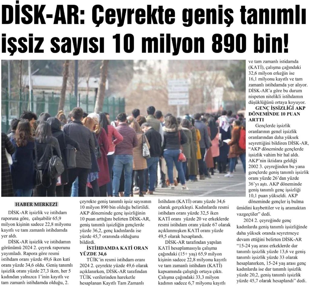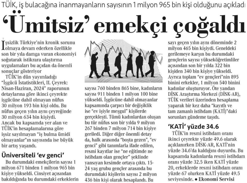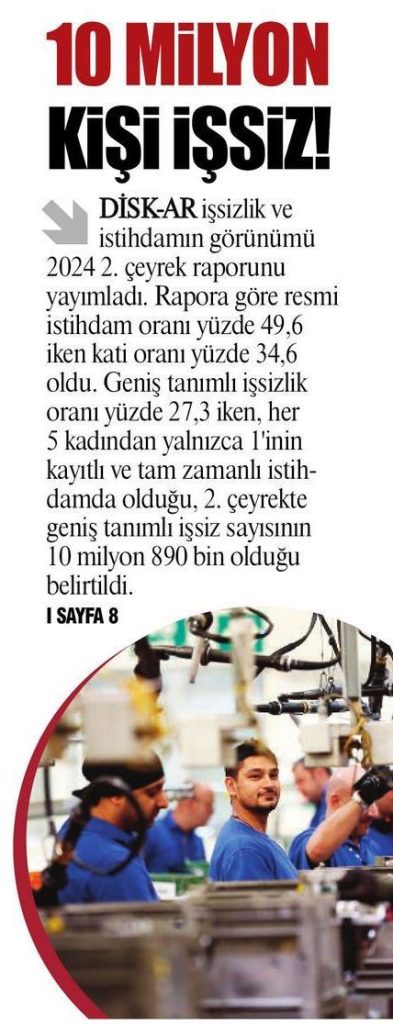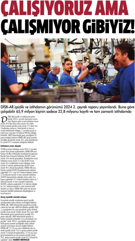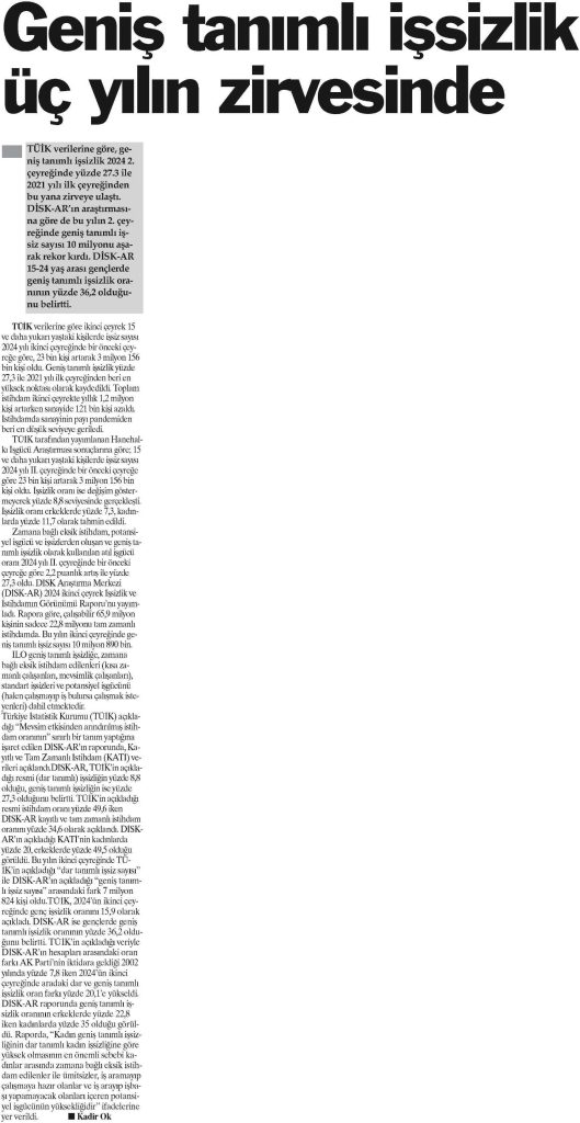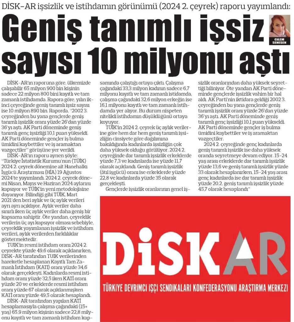 DİSK-AR tarafından hazırlanan ve 19 Ağustos 2024’te yayımlanan “İşsizlik ve İstihdamın Görünümü (2024 2. Çeyrek)” isimli rapor, 20 Ağustos 2024 tarihli yazılı basında yer aldı.