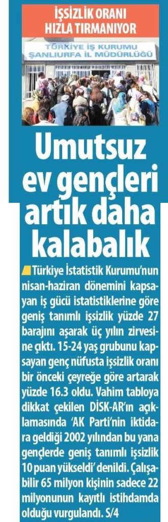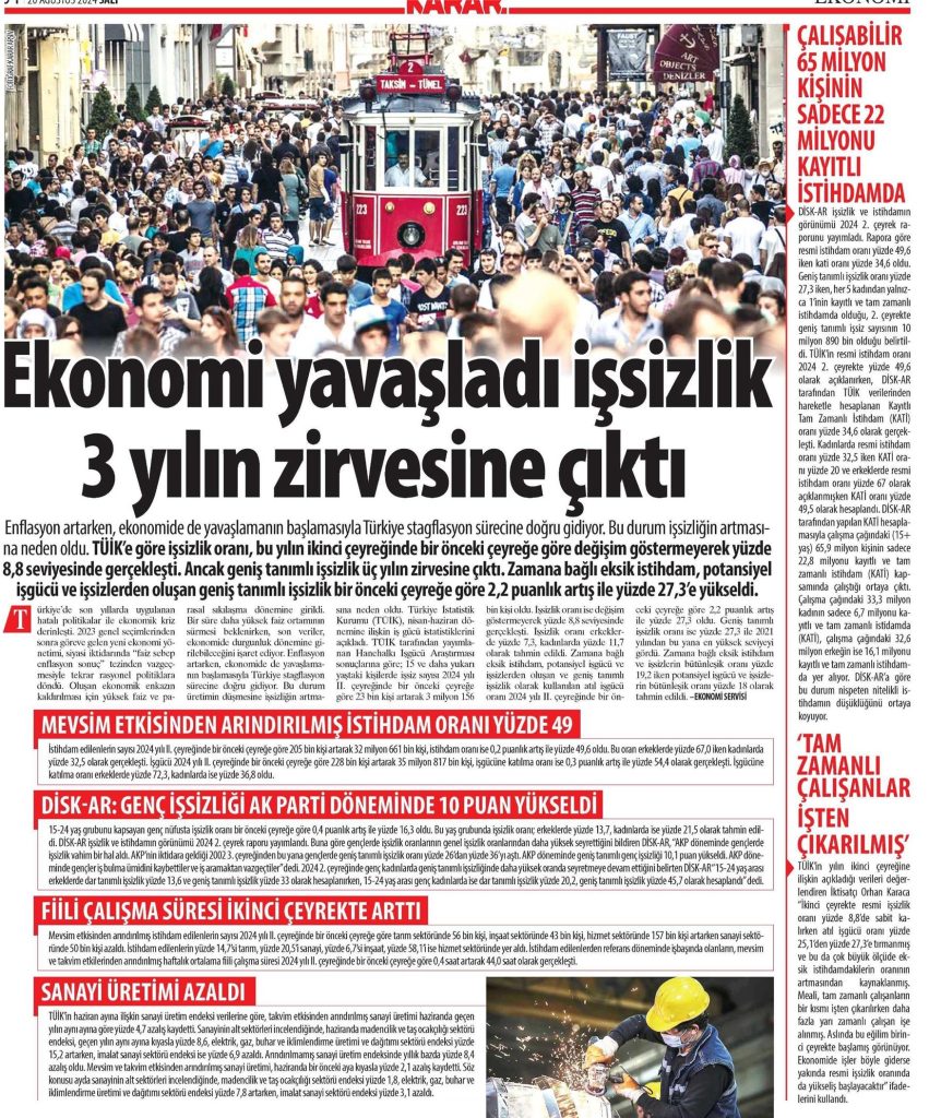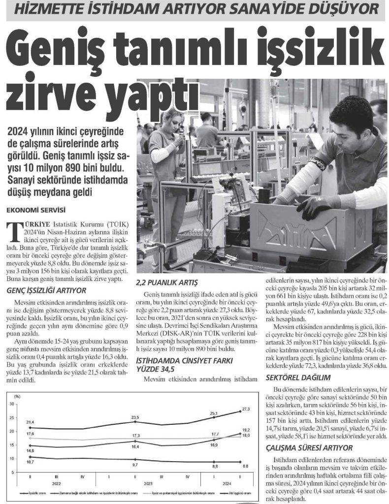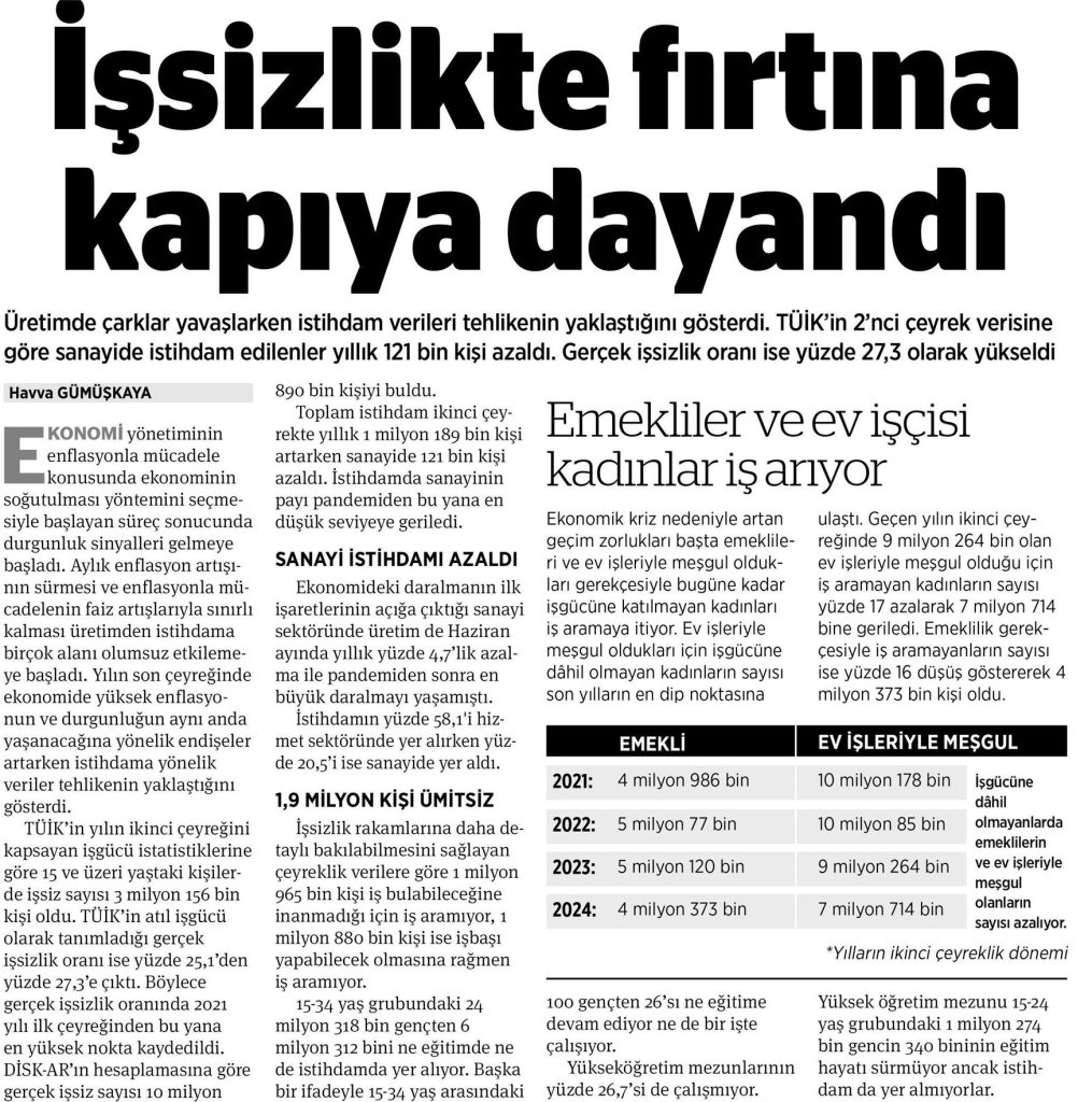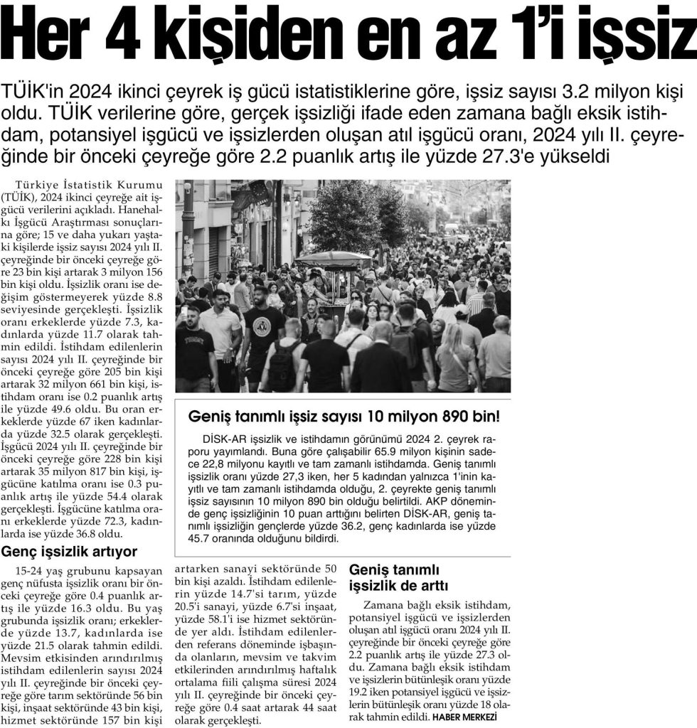 DİSK-AR tarafından hazırlanan ve 19 Ağustos 2024’te yayımlanan “İşsizlik ve İstihdamın Görünümü (2024 2. Çeyrek)” isimli rapor, 20 Ağustos 2024 tarihli yazılı basında yer aldı.