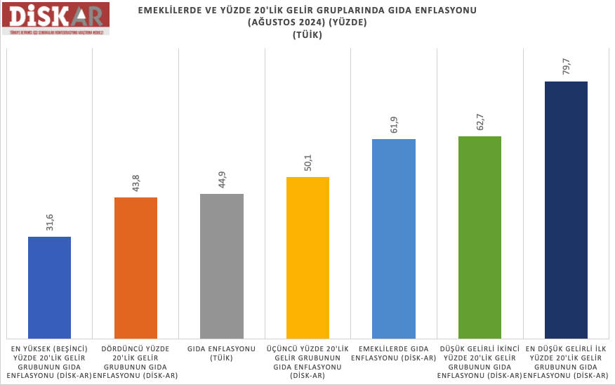 TÜİK, Ağustos 2024 döneminde gıda enflasyonunu yüzde 44,8 olarak açıkladı. Ancak bu enflasyon halkın hissettiği gerçek enflasyonu yansıtmaktan oldukça uzak bir oran. DİSK-AR’ın TÜİK verilerinden yararlanarak yaptığı hesaplamaya göre emeklilerde gıda enflasyonu yüzde 61,9 oldu. Üçüncü yüzde 20’lik gelir grubunun gıda enflasyonu yüzde 50,1 olurken, düşük gelirli ikinci yüzde 20’lik grubun gıda enflasyonu yüzde 62,7 ve en yoksul yüzde 20’lik gelir grubun gıda enflasyonu ise yüzde 79,7 olarak gerçekleşti.