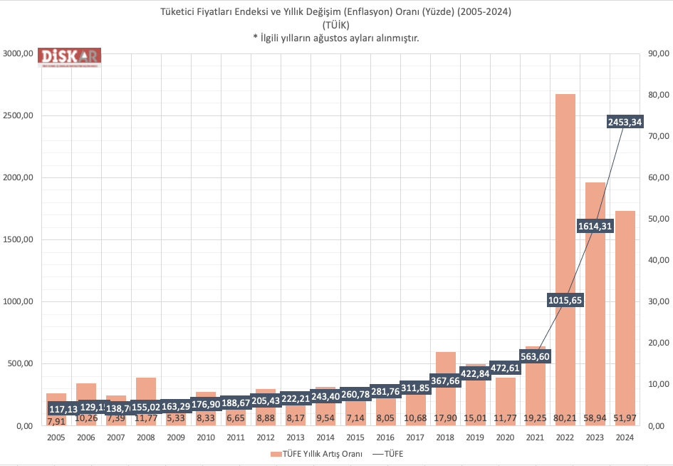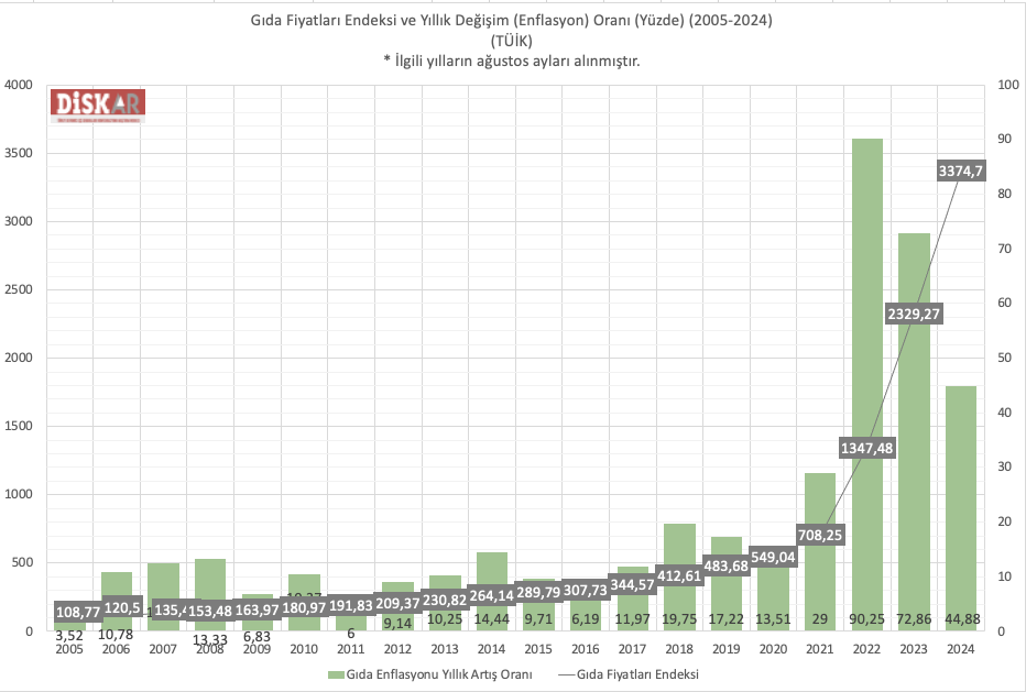 TÜFE ve gıda fiyatları endeksi artmaya devam ediyor. 2005 Ağustos’ta 117 olan TÜFE endeksi, Ağustos 2024’te 2.453’e yükseldi. 2005 Ağustos’ta 108 olan gıda fiyatları endeksi ise 2024 Ağustos’ta 3374’e yükseldi. Ağustos 2005’te yüzde 7,9 olan yıllık enflasyon oranı Ağustos 2024’te yüzde 51,9 oldu. 2005’te yüzde 3,5 olan yıllık gıda enflasyonu ise Ağustos 2024’te yüzde 44,8’e yükseldi.