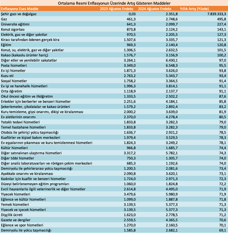 2024 Ağustos döneminde en yüksek fiyat artışı yıllık yüzde 120,81 ile eğitim oldu. İkinci en yüksek fiyat artışının görüldüğü harcama grubu yıllık yüzde 101,49 artışla konut olurken üçüncü harcama grubu ise yüzde 67,70 ile lokanta ve oteller oldu.