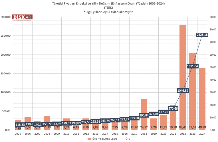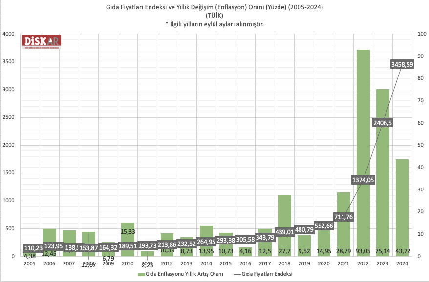 TÜFE ve gıda fiyatları endeksi artmaya devam ediyor. 2005 Ağustos’ta 118 olan TÜFE endeksi, Ağustos 2024’te 2526’ya yükseldi. 2005 Ağustos’ta 110 olan gıda fiyatları endeksi ise 2024 Ağustos’ta 3458’e yükseldi. Ağustos 2005’te yüzde 7,9 olan yıllık enflasyon oranı Ağustos 2024’te yüzde 49,3 oldu. 2005’te yüzde 4,3 olan yıllık gıda enflasyonu ise Ağustos 2024’te yüzde 43,7’ye yükseldi.