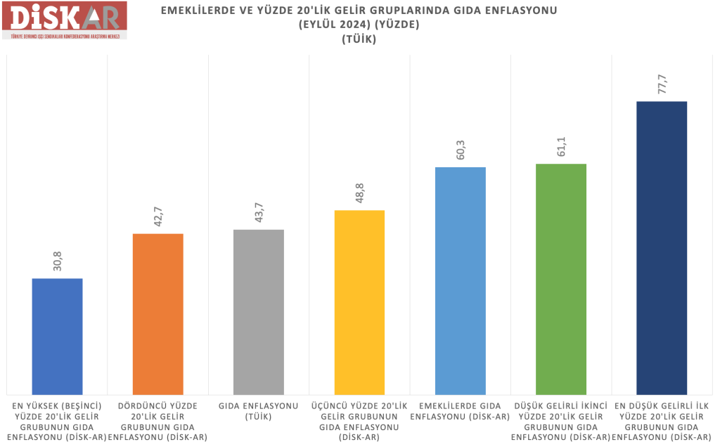 TÜİK, Eylül 2024 döneminde gıda enflasyonunu yüzde 43,7 olarak açıkladı. Ancak bu enflasyon halkın hissettiği gerçek enflasyonu yansıtmaktan oldukça uzak bir oran. DİSK-AR’ın TÜİK verilerinden yararlanarak yaptığı hesaplamaya göre emeklilerde gıda enflasyonu yüzde 60,3 oldu. Üçüncü yüzde 20’lik gelir grubunun gıda enflasyonu yüzde 48,8 olurken, düşük gelirli ikinci yüzde 20’lik grubun gıda enflasyonu yüzde 61,1 ve en yoksul yüzde 20’lik gelir grubun gıda enflasyonu ise yüzde 77,7 olarak gerçekleşti.