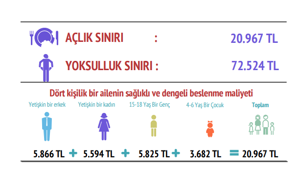 TÜİK (Türkiye İstatistik Kurumu) harcama gruplarına göre endeks rakamları, 2003 yıllı madde fiyatları ile İstanbul Halk Ekmek, zincir market cari ay internet fiyatları ve BİSAM Beslenme Kalıbı üzerinden yapılan hesaplamaya göre dört kişilik bir ailenin sağlıklı ve dengeli beslenmesi için aylık yapması gereken harcama tutarı Kasım 2024 için 20 bin 967 liradır. Bu harcama tutarı sadece gıda için yapılması gereken minimum tutardır. Açlık sınırı üzerinden hanehalkı tüketim harcamaları esas alınarak yapılan hesaplama sonuçlarına göre ise yoksulluk sınırı 72 bin 524 lira olarak gerçekleşmiştir.