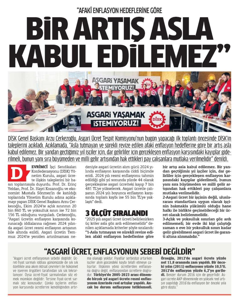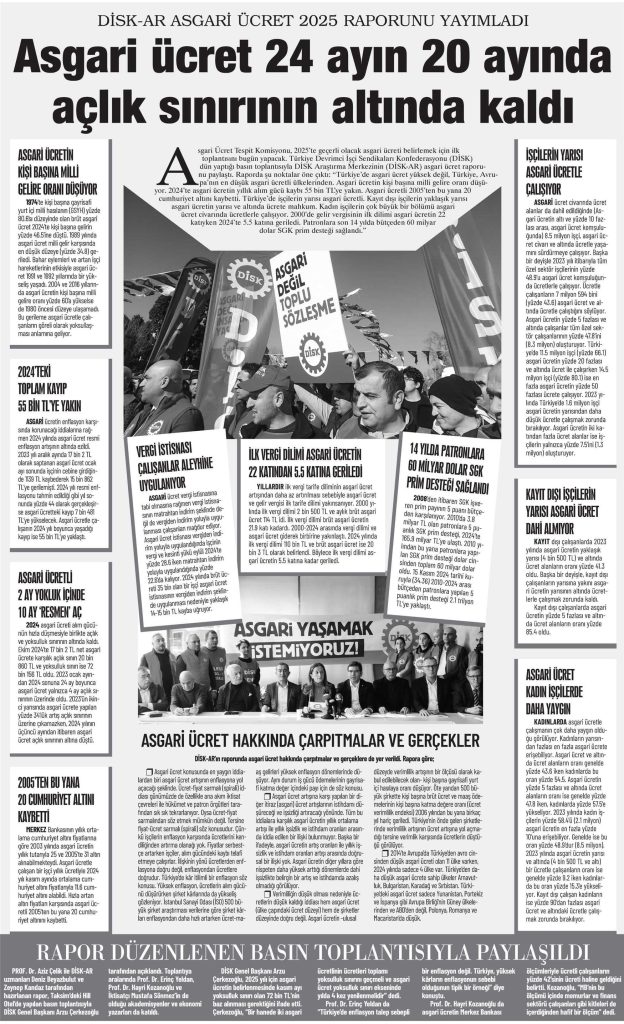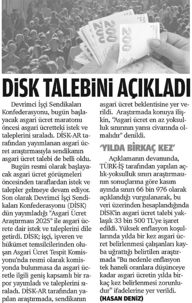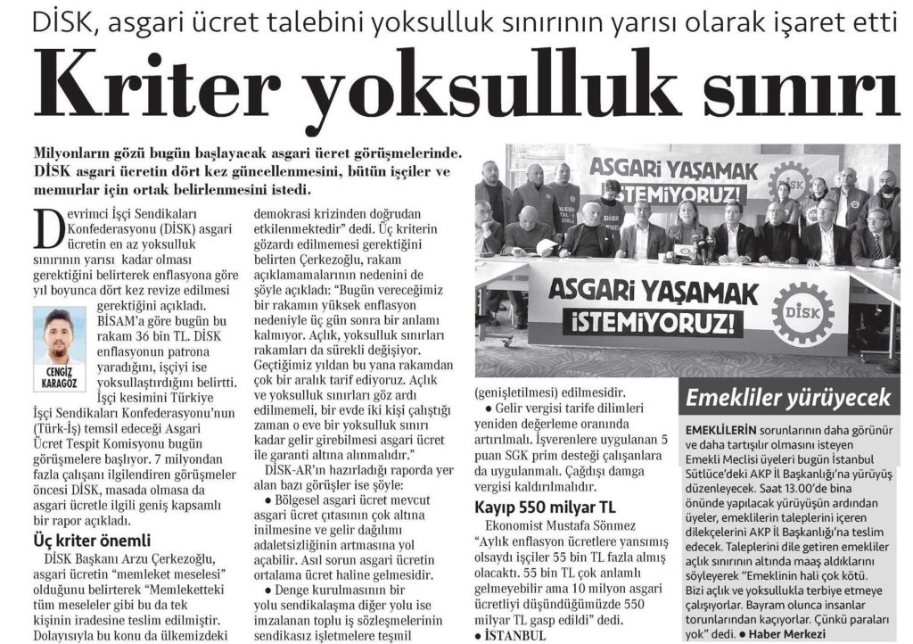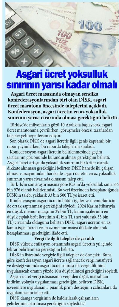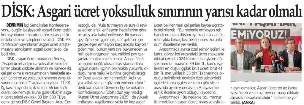 DİSK-AR tarafından hazırlanan ve 9 Aralık 2024’te yayımlanan “Asgari Ücret Araştırması (2025)” isimli araştırma 10 Aralık 2024’te yazılı basında geniş bir biçimde yer aldı.