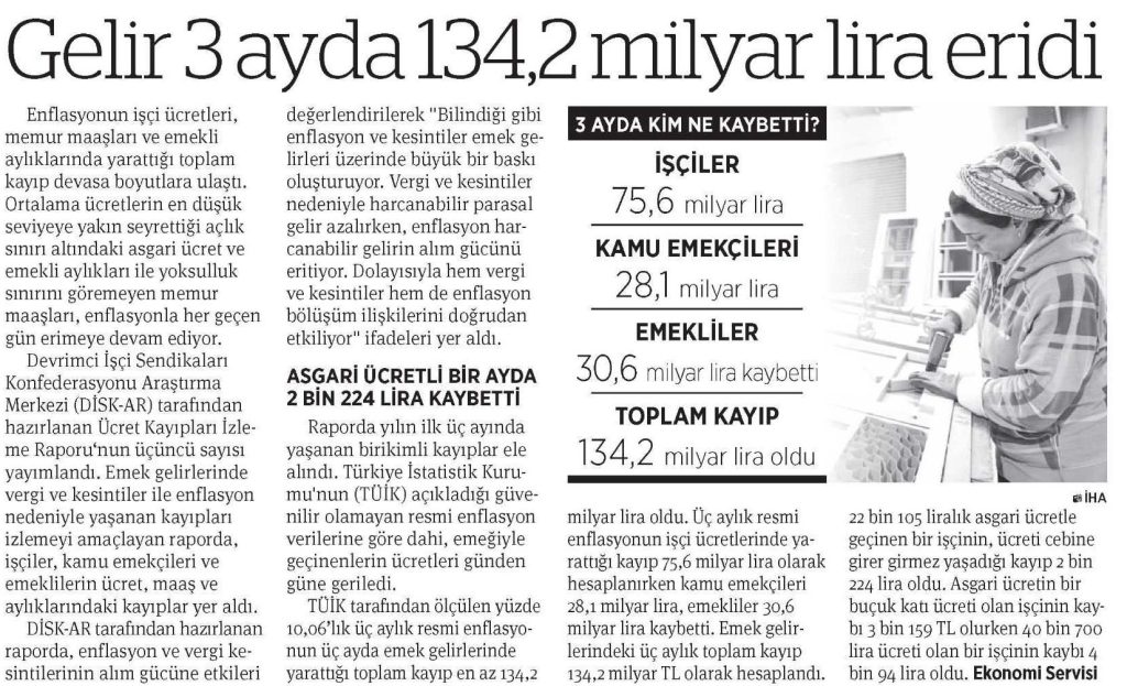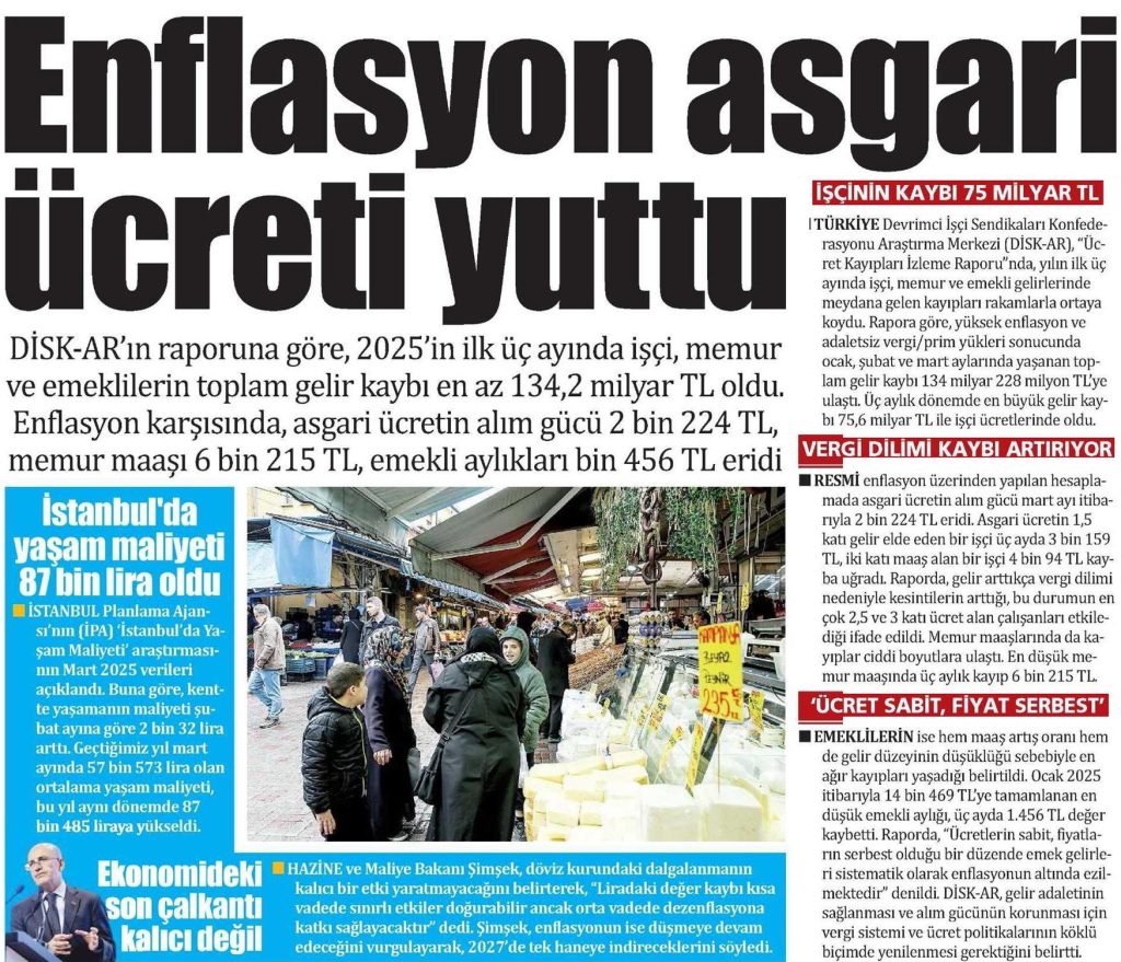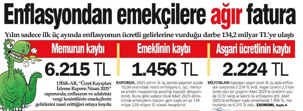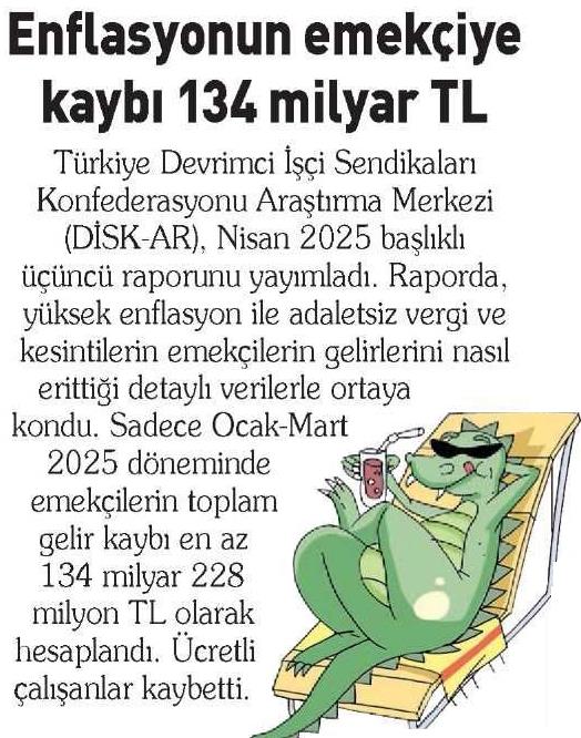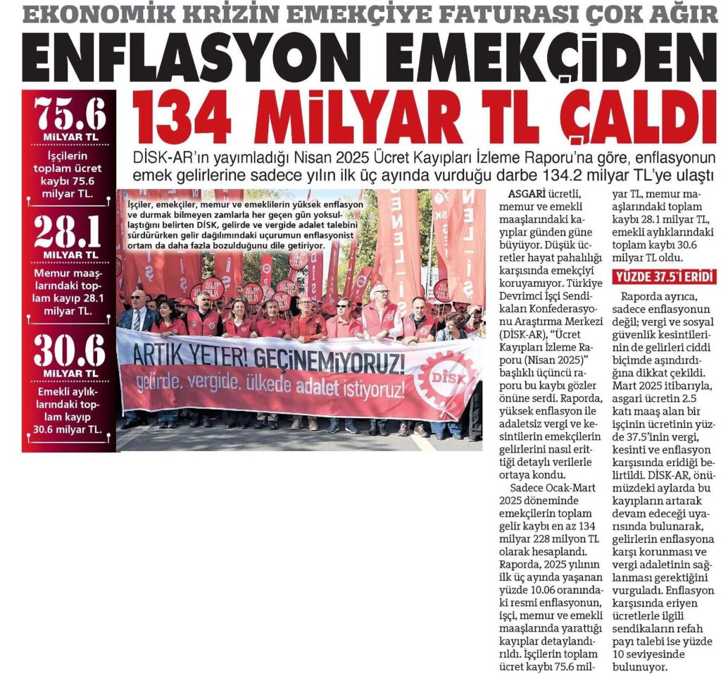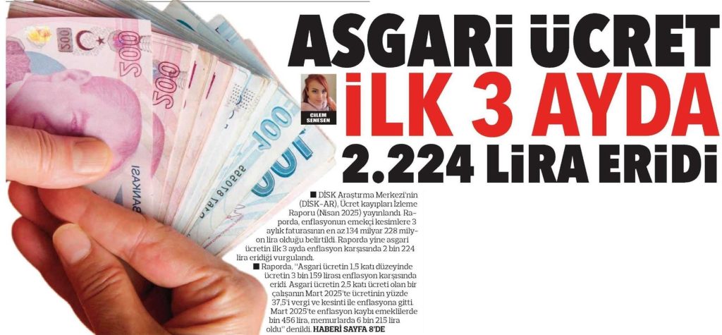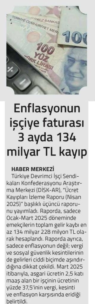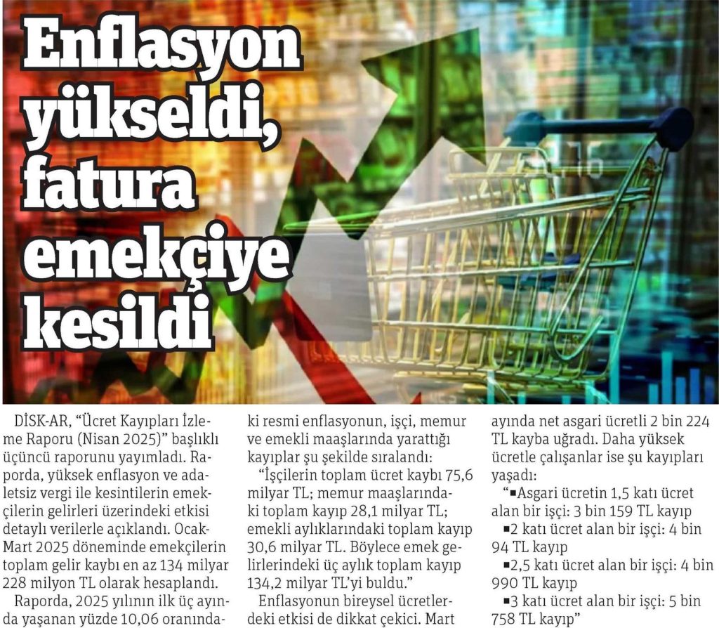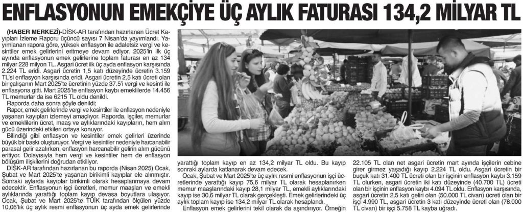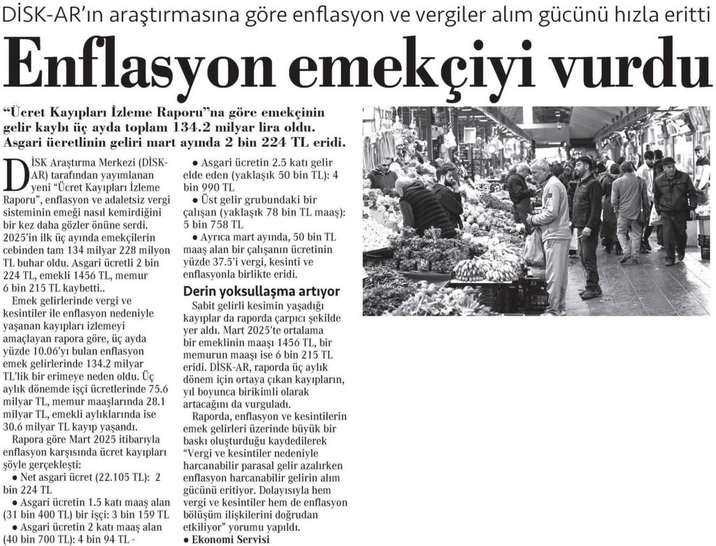 DİSK-AR tarafından hazırlanan ve 7 Nisan 2025’te yayımlanan “Ücret Kayıpları İzleme Raporu” isimli çalışma, 8 Nisan 2025 tarihli yazılı basında yer aldı.