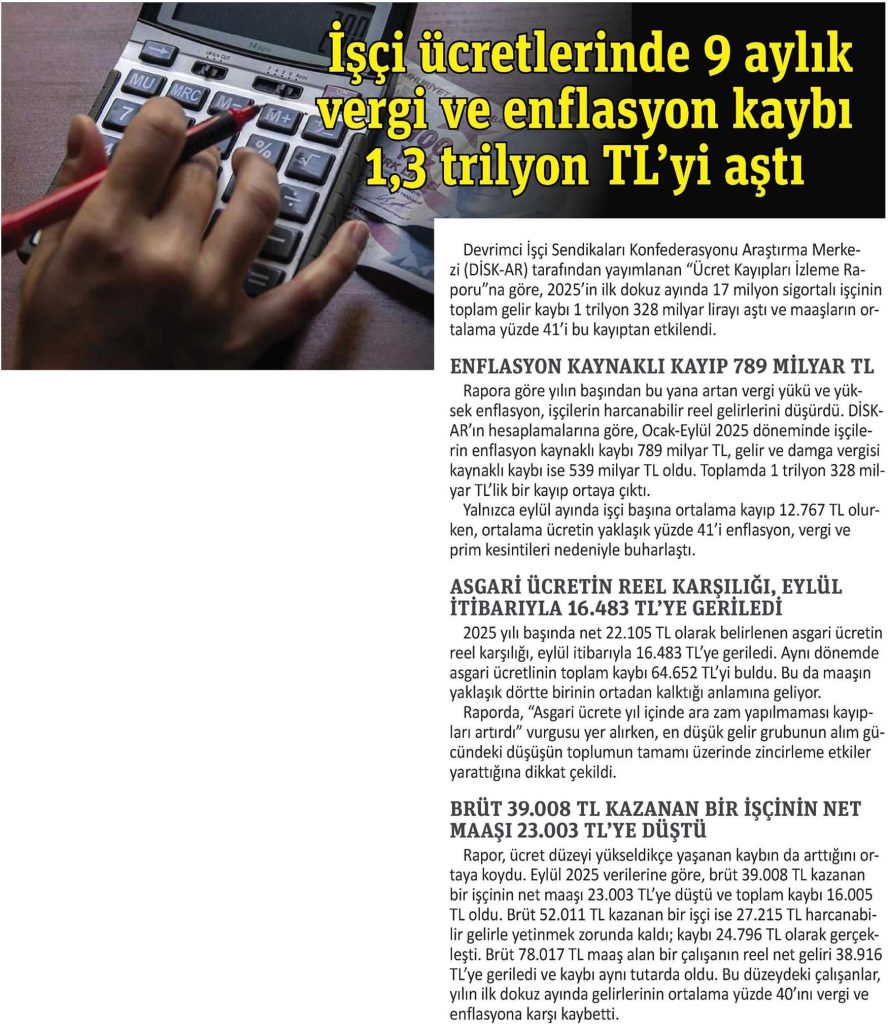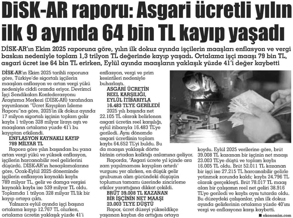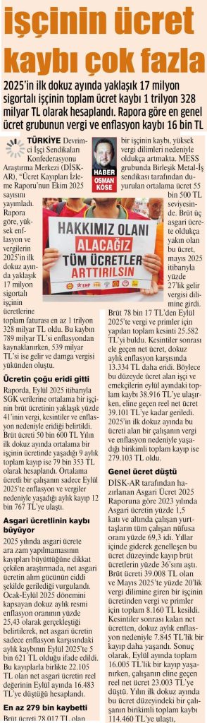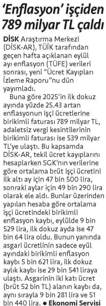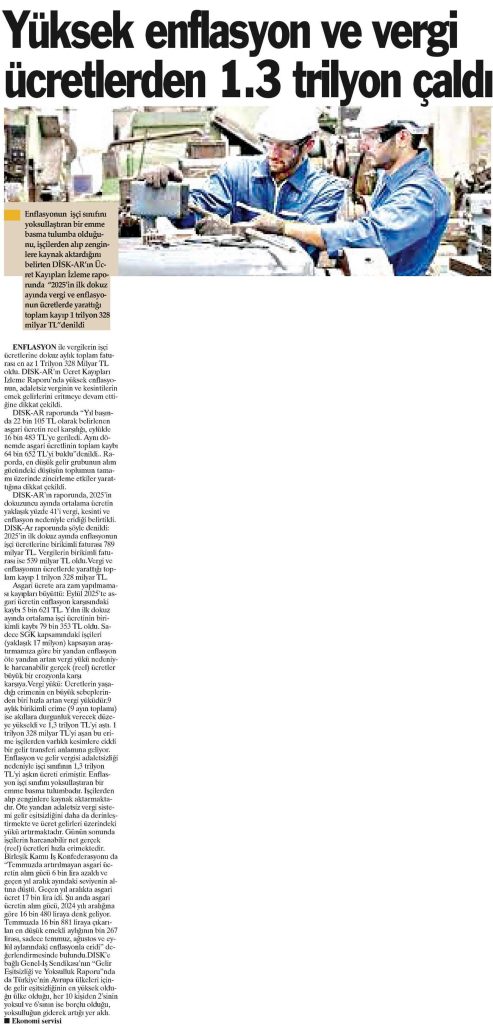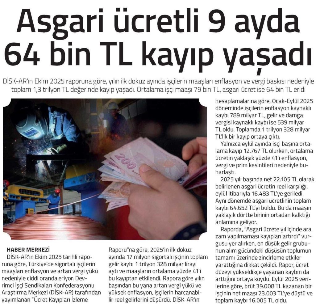 DİSK-AR tarafından hazırlanan ve 6 Ekim 2025’te yayımlanan “1,3 trilyonu aşkın kayıp!” başlıklı Ücret Kayıpları İzleme Raporu (Ekim 2025), 7 Ekim 2025 tarihli yazılı basında geniş yer buldu.