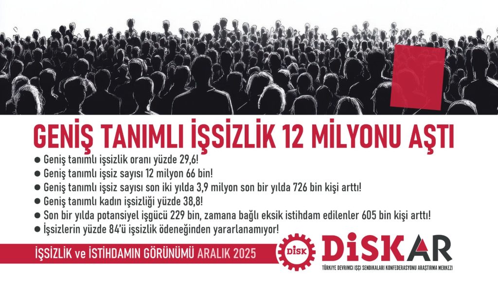 TÜİK’in Ekim 2025 Hanehalkı İşgücü Araştırması (HİA) sonuçları 28 Kasım 2025’te yayımlandı. Mevsim etkisinden arındırılmış dar tanımlı işsizlik oranı yüzde 8,5 mevsim etkisinden arındırılmış geniş tanımlı işsizlik oranı (âtıl işgücü) ise yüzde 29,6 olarak açıklandı. TÜİK’e göre Türkiye genelinde 15 ve daha yukarı yaştaki kişilerde dar tanımlı işsiz sayısı (mevsim etkisinden arındırılmış) 2025 Ekim ayında 3 milyon 33 bin oldu. DİSK-AR tarafından hesaplanan geniş tanımlı işsiz sayısı ise 12 milyon 66 bin oldu. Geniş tanımlı işsizlik ile dar tanımlı işsizlik arasında uçurum artıyor.