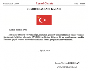 28 Temmuz 2020 tarihinde Resmi Gazete’de yayımlanan 7252 sayılı Kanun’la her defasında en fazla üçer aylık sürelerle 30/6/2021 tarihine kadar Cumhurbaşkanı kararıyla uzatılmasına olanak tanınmıştı.