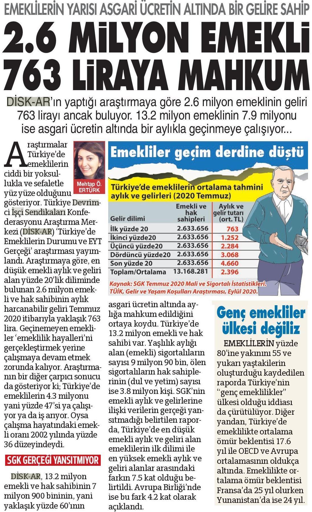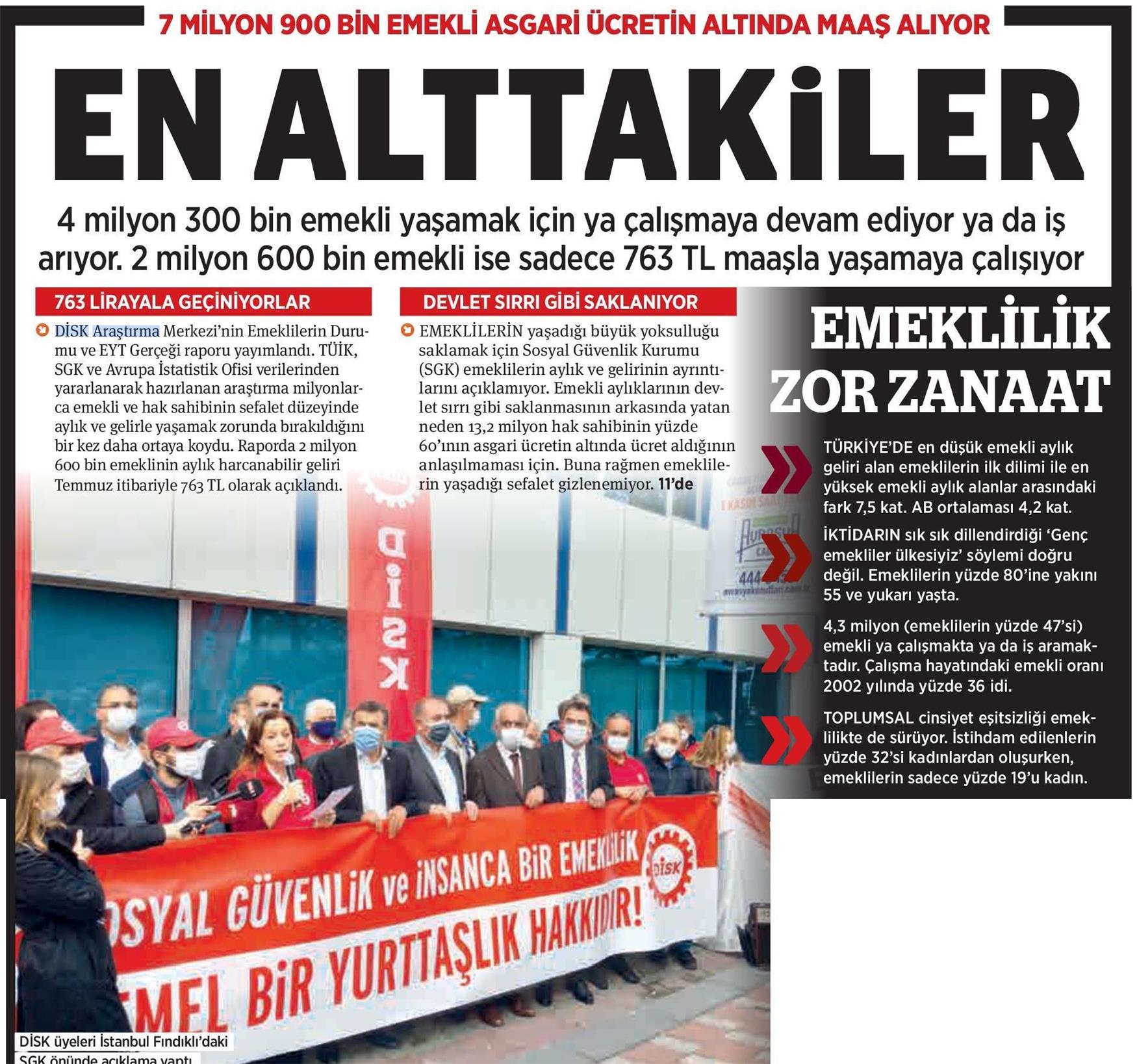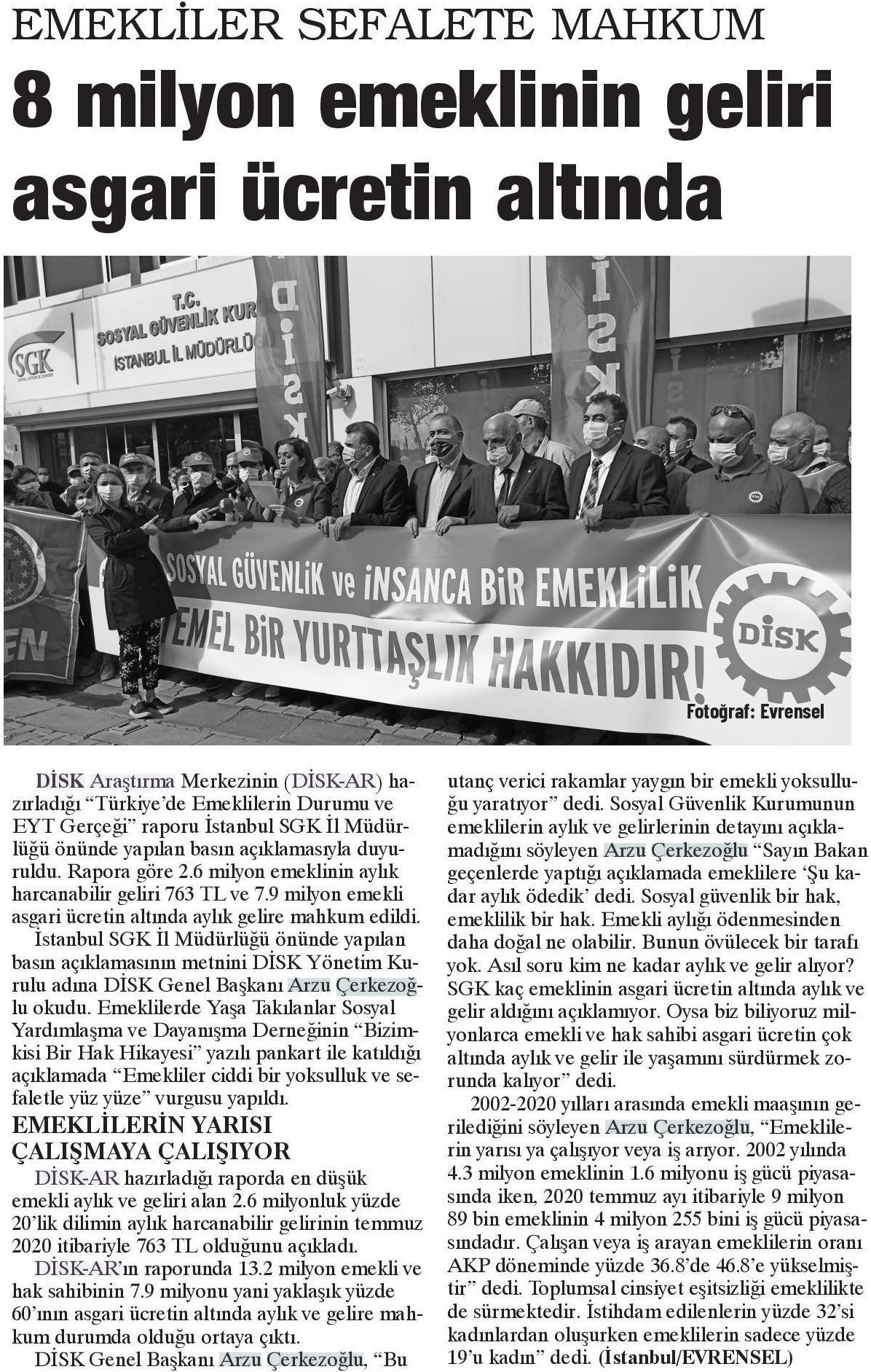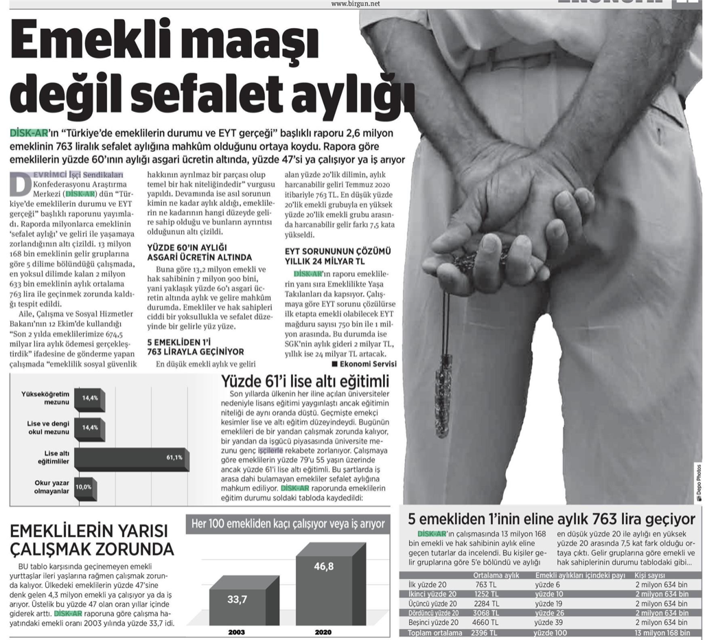 22 Ekim 2020 günü Türkiye Devrimci İşçi Sendikaları Konfederasyonu’nun (DİSK) Sosyal Güvenlik Kurumu (SGK) önünde yaptığı basın açıklamasıyla kamuoyuna duyurulan DİSK-AR’ın Türkiye’de Emeklilerin Durumu ve EYT Gerçeği Araştırması basında geniş yer buldu.