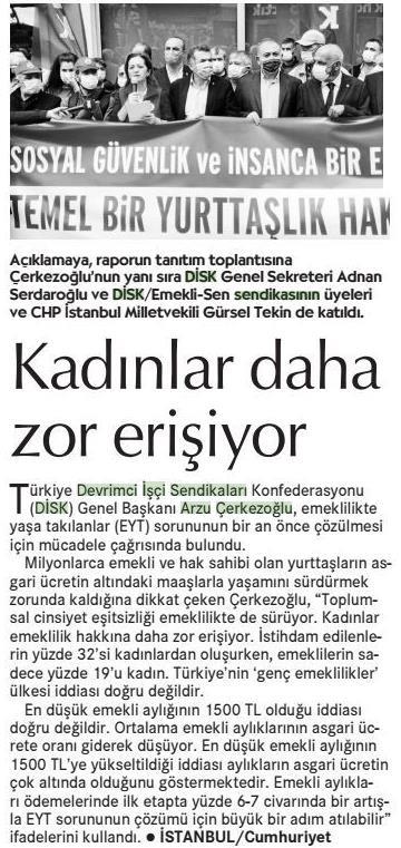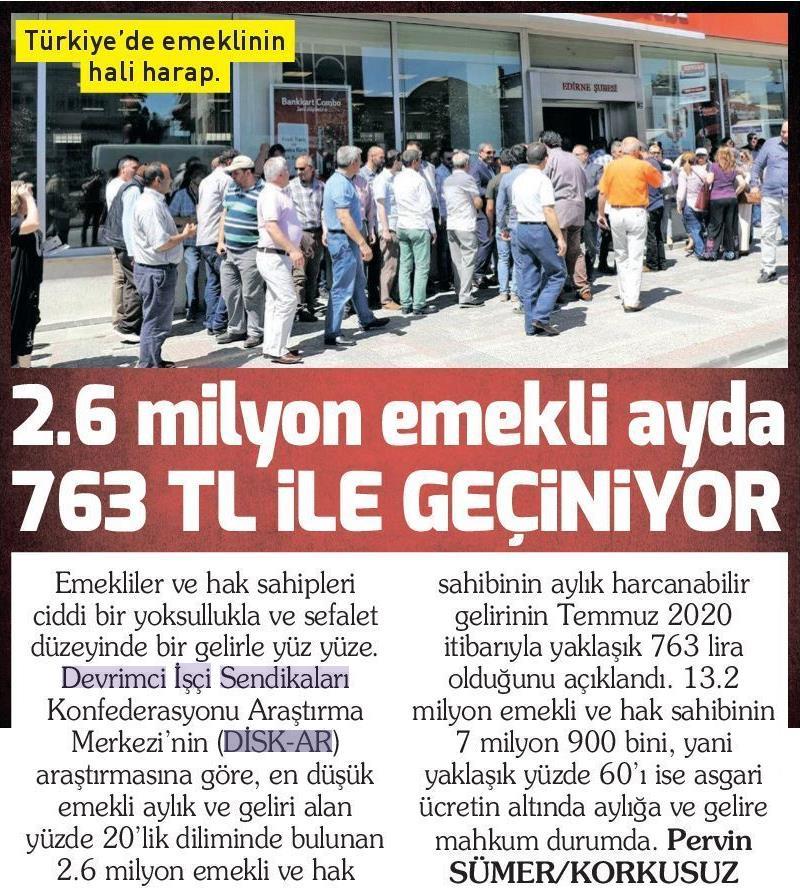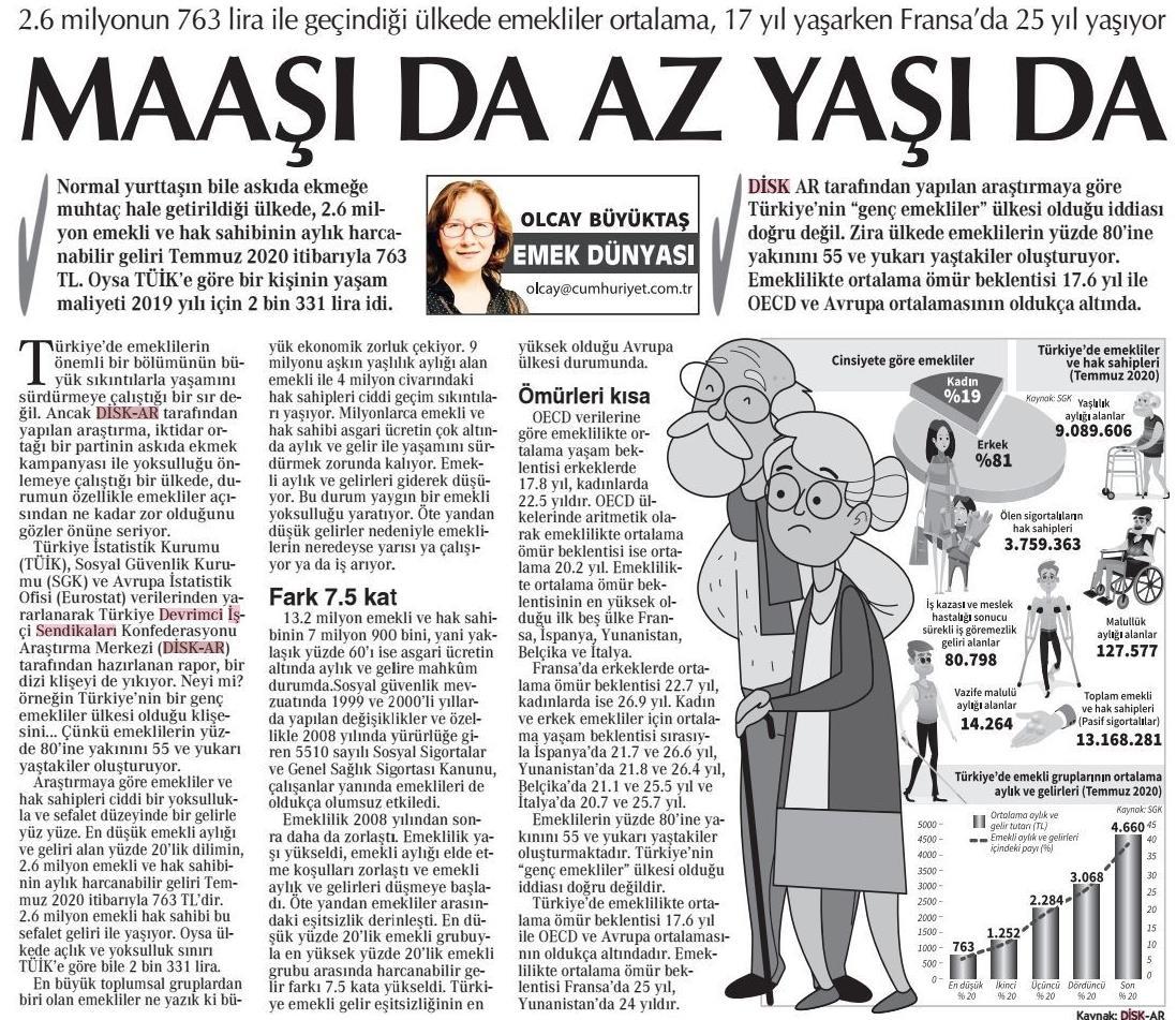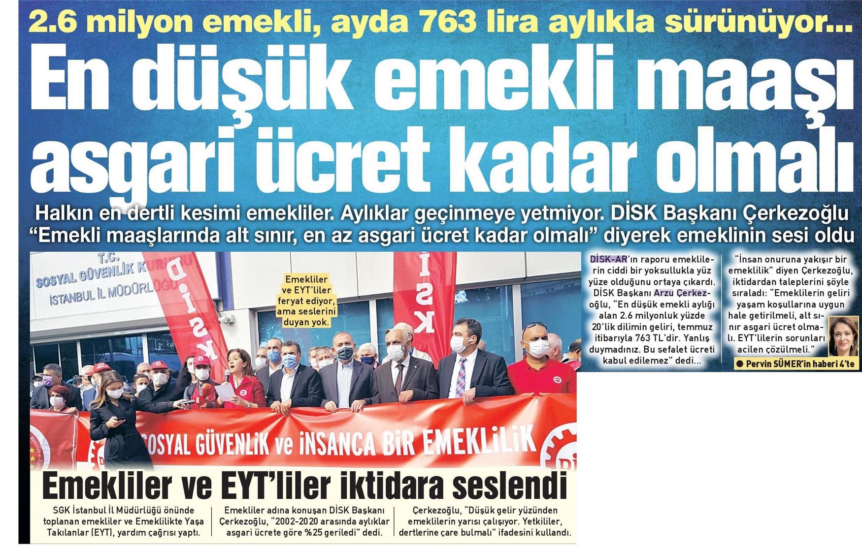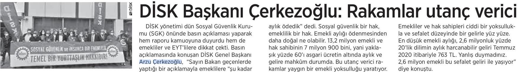 22 Ekim 2020 günü Türkiye Devrimci İşçi Sendikaları Konfederasyonu’nun (DİSK) Sosyal Güvenlik Kurumu (SGK) önünde yaptığı basın açıklamasıyla kamuoyuna duyurulan DİSK-AR’ın Türkiye’de Emeklilerin Durumu ve EYT Gerçeği Araştırması basında geniş yer buldu.