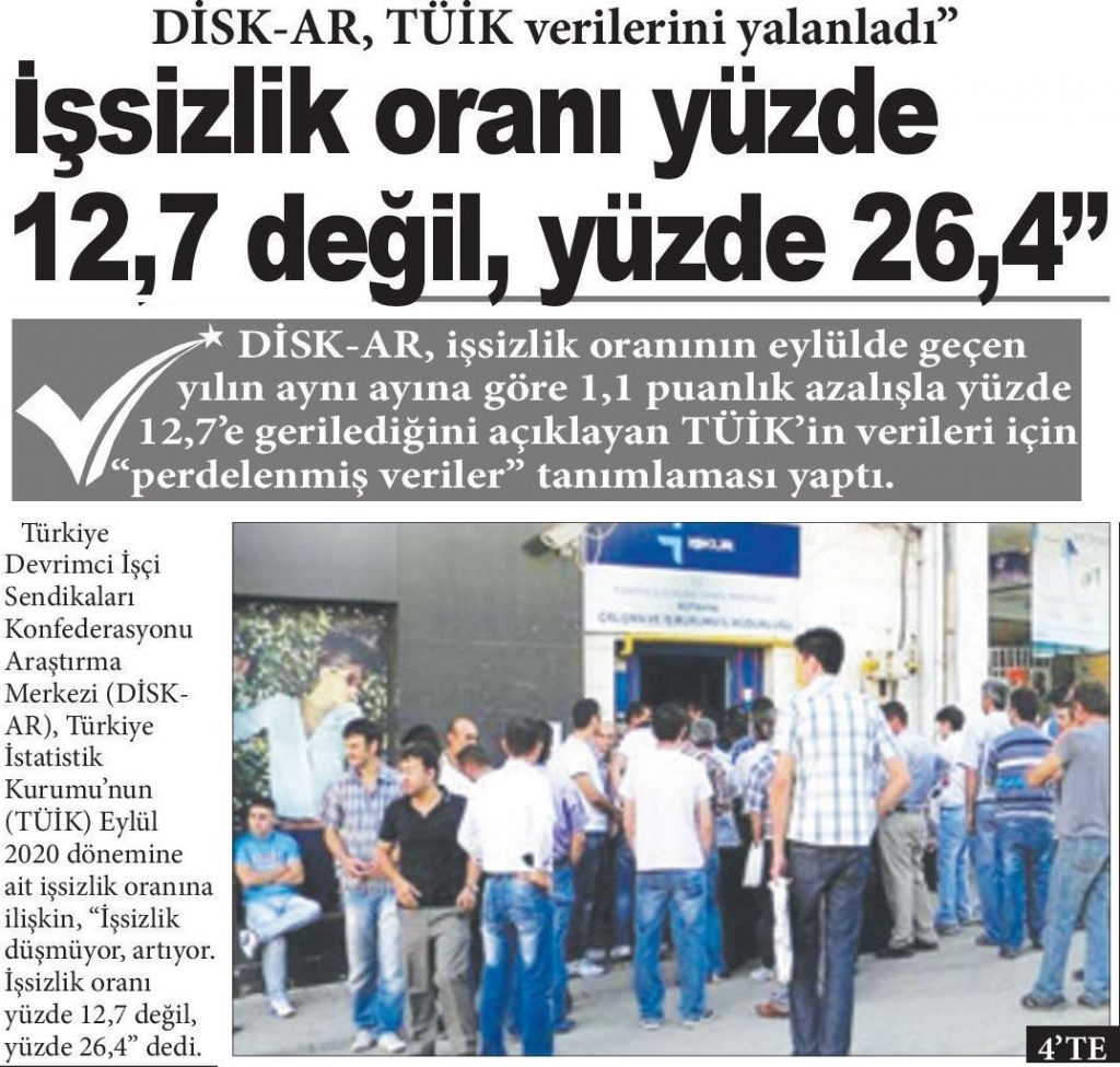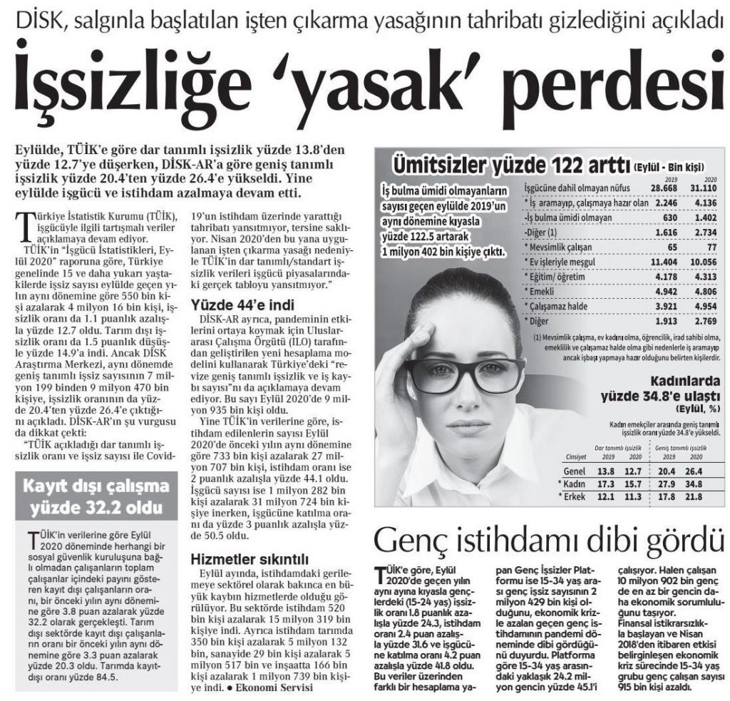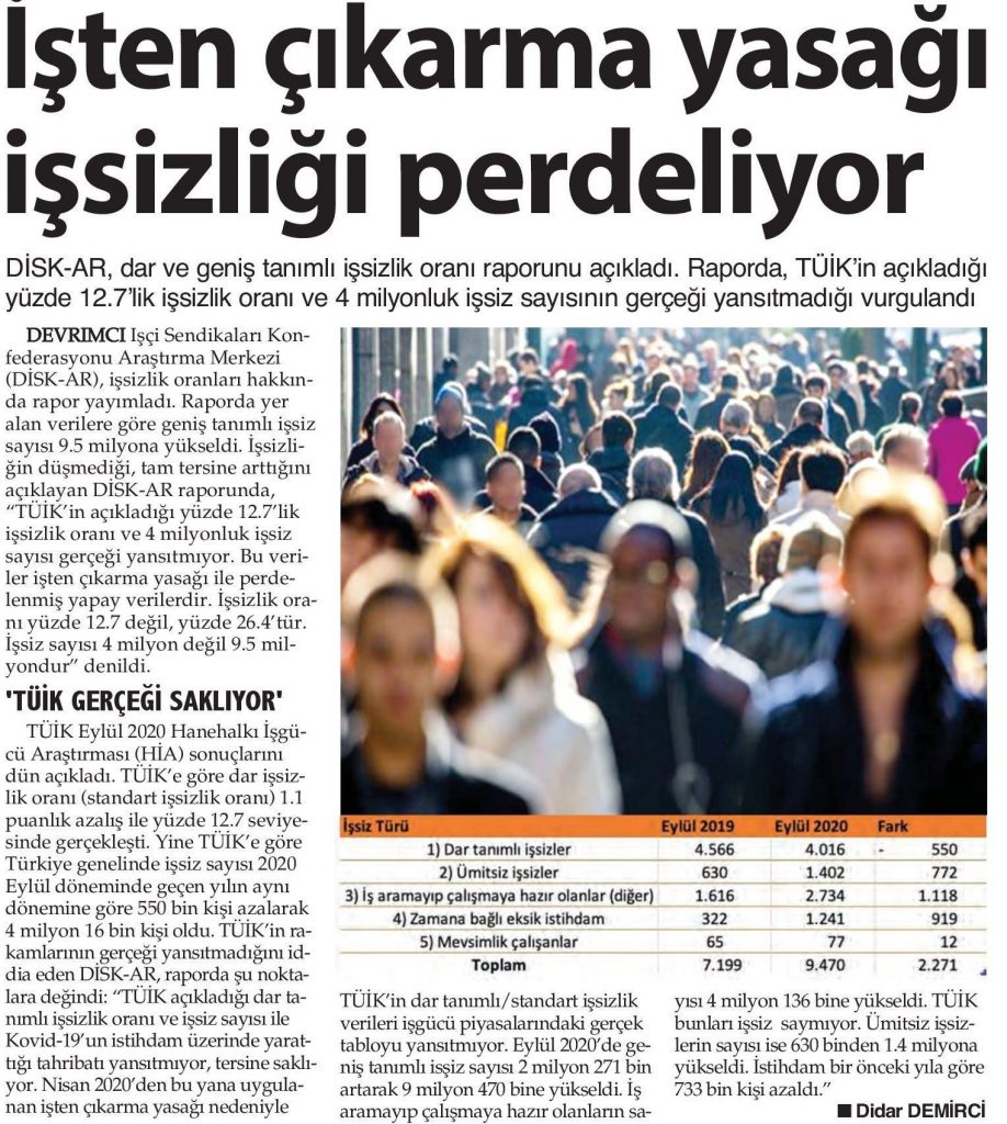 DİSK-AR tarafından hazırlanan ve 10 Aralık 2020 günü yayımlanan Eylül 2020 dönemine ait İşsizlik ve İstihdamın Görünümü Raporu’na 11 Aralık 2020 günü yazılı basında geniş bir yer verildi.