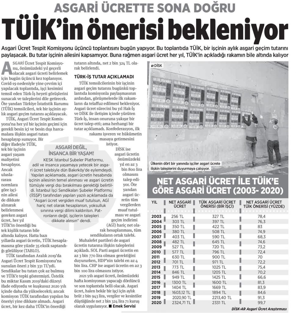 BirGün gazetesi haberinde DİSK-AR verilerine yer verildi 22 Aralık 2020 22 Aralık 2020 tarihli BirGün gazetesinde emek servisi tarafından hazırlanan “Asgari ücrette sona doğru: TÜİK’in önerisi bekleniyor” başlıklı haberde DİSK-AR’ın Salgın Günlerinde Asgari Ücret Gerçeği Araştırması verilerine yer verildi. Haber metnine ulaşmak için görsele tıklayınız.