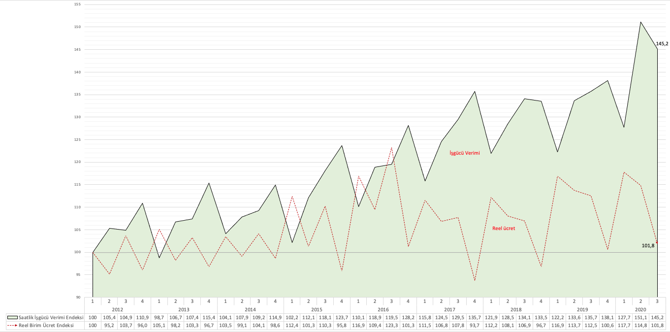 2012-2020 arasında saatlik işgücü verimi yüzde 45,2 birim reel birim ücret sadece 1,8 birim arttı.