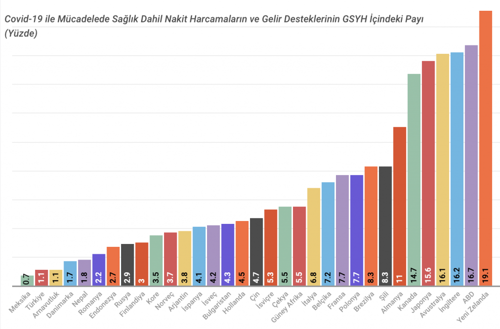 Covid-19 döneminde hükümetlerce yapılan nakit harcama ve gelir desteklerinin GSYH içindeki payının en az olduğu üç ülke ise (IMF tasnifinde yer alan seçilmiş ülkeler içinde düşük gelirli ülkeler hariç) Meksika, Türkiye ve Arnavutluk oldu. Meksika’da nakit harcamaların ve gelir desteklerinin GSYH içindeki payı yüzde 0,7’dir. Türkiye ve Arnavutluk’un Covid-19 döneminde nakit harcamalarının GSYH içindeki payı yüzde 1,1 düzeyindedir.