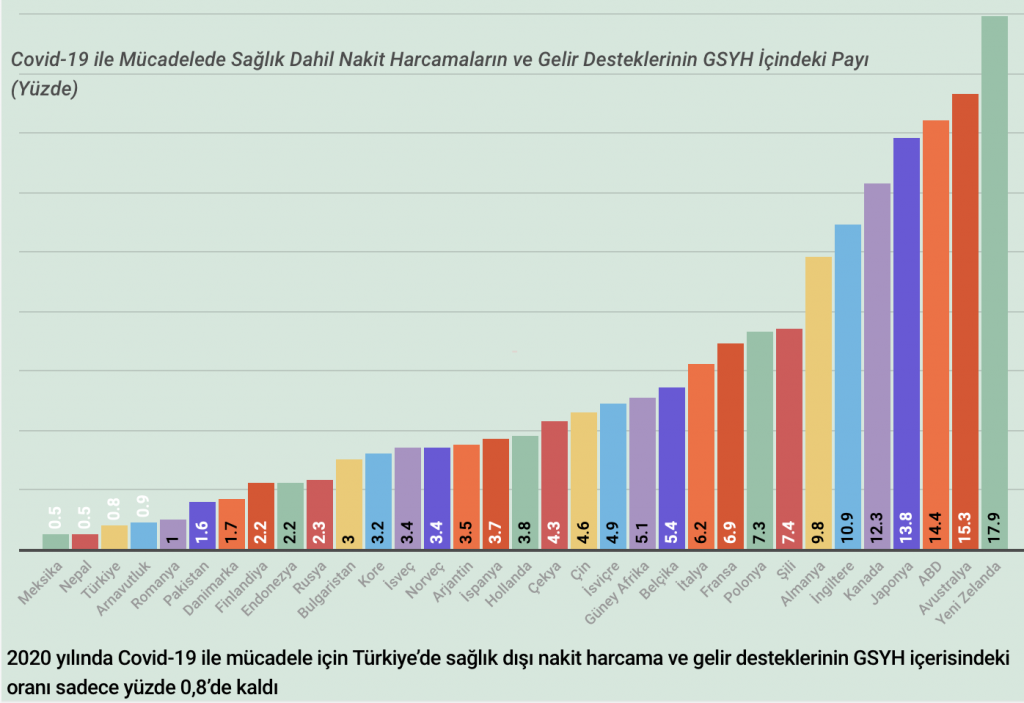 Almanya, Polonya, Fransa, İtalya, Belçika gibi AB ülkeleri ile Güney Afrika’da toplam sağlık dışı nakit harcamaların milli gelire oranı yüzde 5 ile 10 arasındadır. Romanya, Pakistan, Danimarka, Finlandiya, Endonezya, Rusya, Bulgaristan, Kore, İsveç, Norveç, Arjantin, İspanya, Hollanda, Çekya, Çin ve İsviçre’de sağlık dışı nakit harcama ve gelir destekleri ülkelerin GSYH’si içinde yüzde 1 ile 5 arasında değişiyor. Meksika, Nepal, Arnavutluk ve Türkiye’de ise sağlık dışı nakit harcamaların GSYH içerisindeki payı yüzde 1’in altındadır. Türkiye, Nepal ve Meksika’dan sonra ülkeler arasında Covid-19 döneminde çalışanlara nakdi desteği en az yapan ülke olmuştur. Türkiye’de bu oran yüzde 0,8 düzeyinde kalmaktadır.