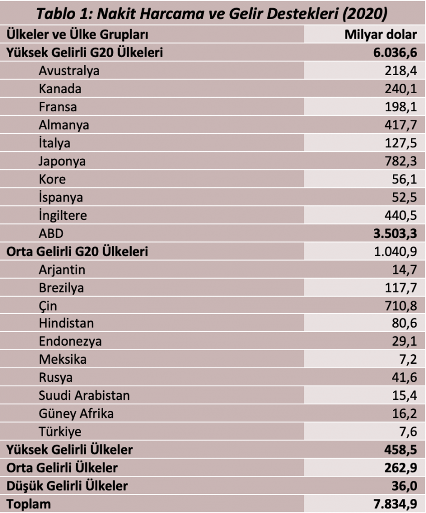 Türkiye’de Covid-19 kapsamında 2020 yılında yapılan toplam nakit desteği 42,8 milyar TL’dir. Türkiye tarafından yapılan nakit destek ve harcamalar hem oransal hem de miktar olarak diğer ülkeler ile karşılaştırılamayacak kadar düşüktür. Öte yandan Türkiye’de yapılan toplam 42,8 milyar TL’lik nakit transferin 35 milyar TL’si işsizlik sigortası fonundan, yaklaşık 6,4 milyarı Sosyal Yardımlaşma ve Dayanışma Fonundan ve 2 milyar TL’si ise bağış kampanyasından sağlanmıştır. Böylece Türkiye tarafından yapılan nakit desteklerde bütçeden doğrudan ayrılan kaynak söz konusu değildir.