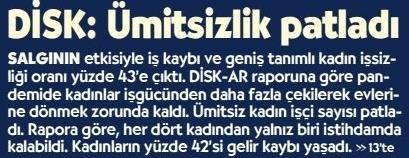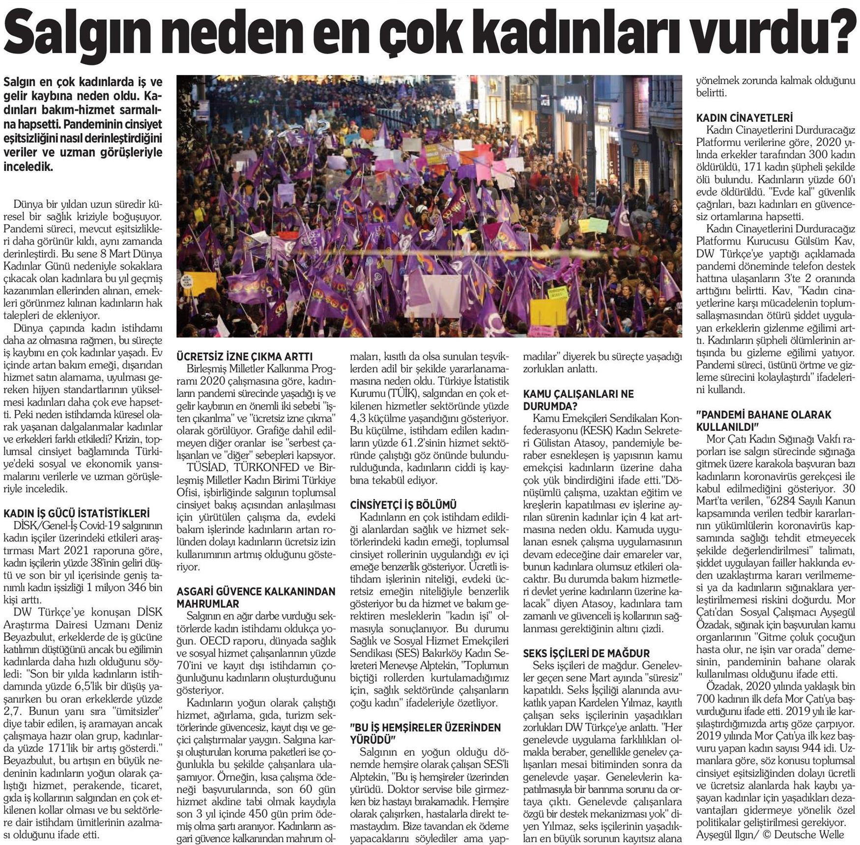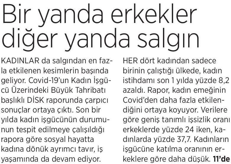 DİSK-AR tarafından hazırlanan ve 7 Mart 2021 tarihinde yayımlanan “Covid-19 Döneminde Kadın İşgücünün Durumu” adlı araştırma yazılı basında yer aldı.