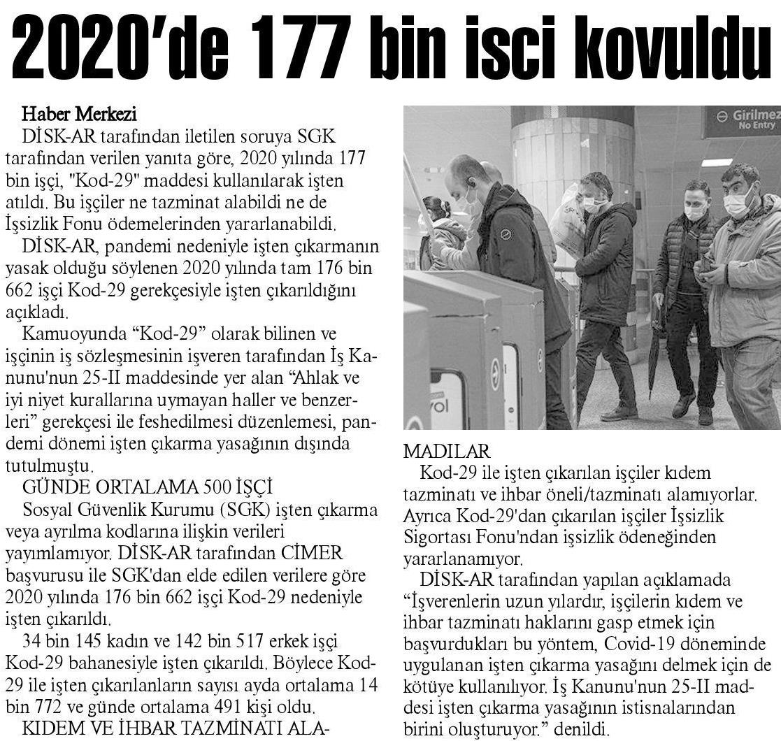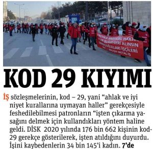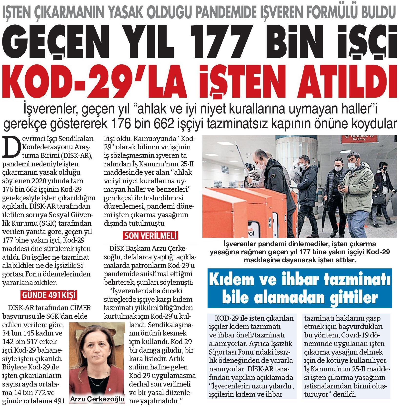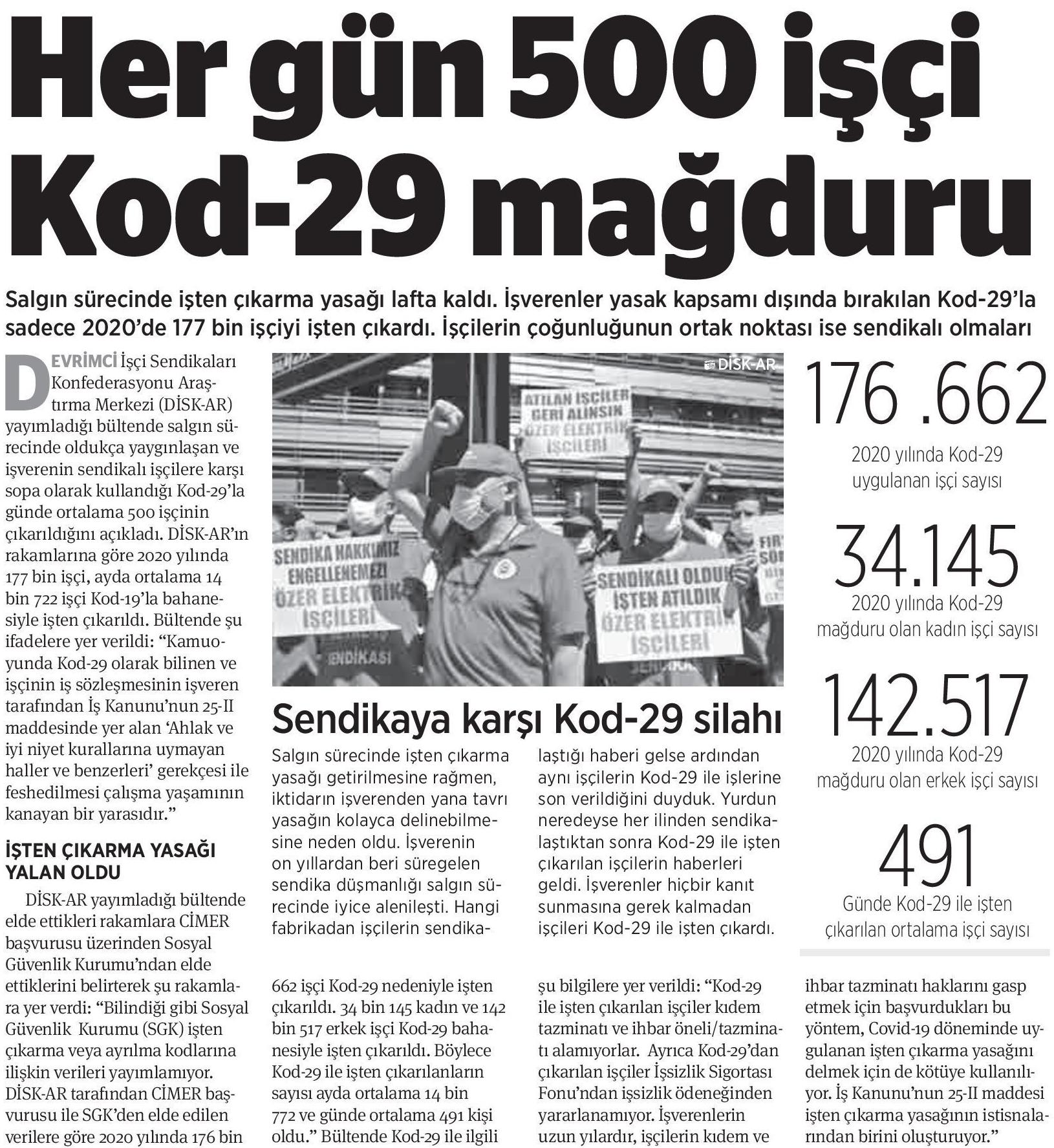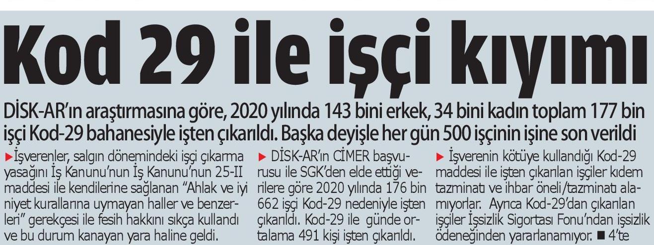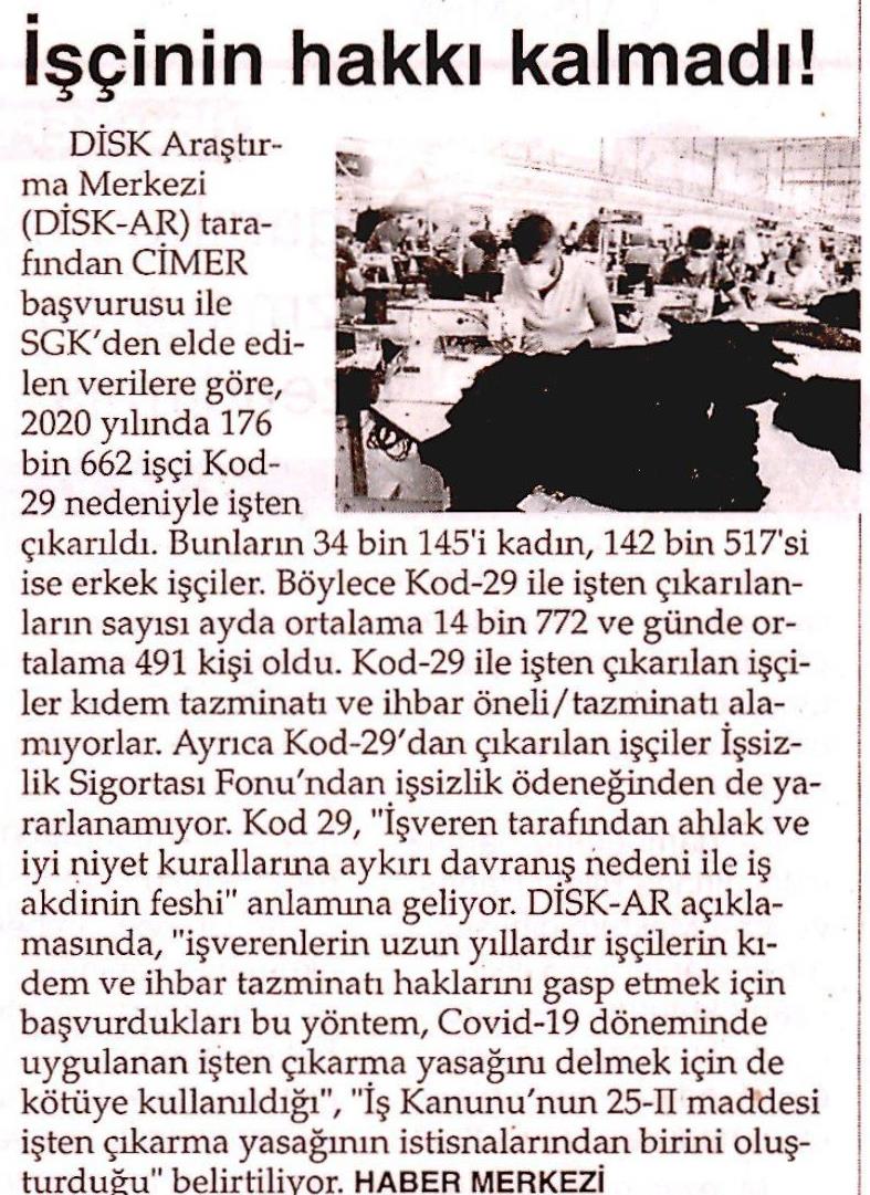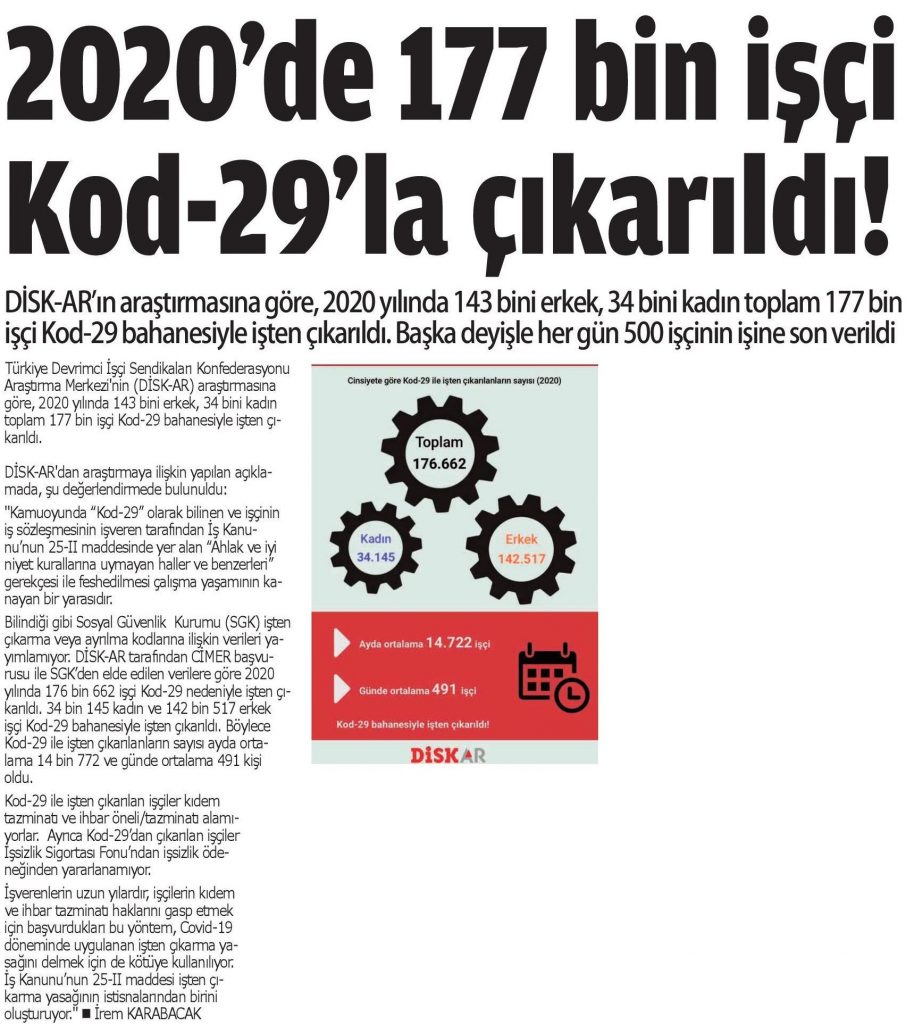 DİSK-AR tarafından hazırlanan ve 6 Nisan 2020’de yayımlanan “Kod-29 kıyımı: 143 bini erkek, 34 bini kadın toplam 177 bin işçi!” isimli haber bülteni 7 Nisan 2020 ve 8 Nisan 2021 tarihli yazılı basında geniş yer buldu.