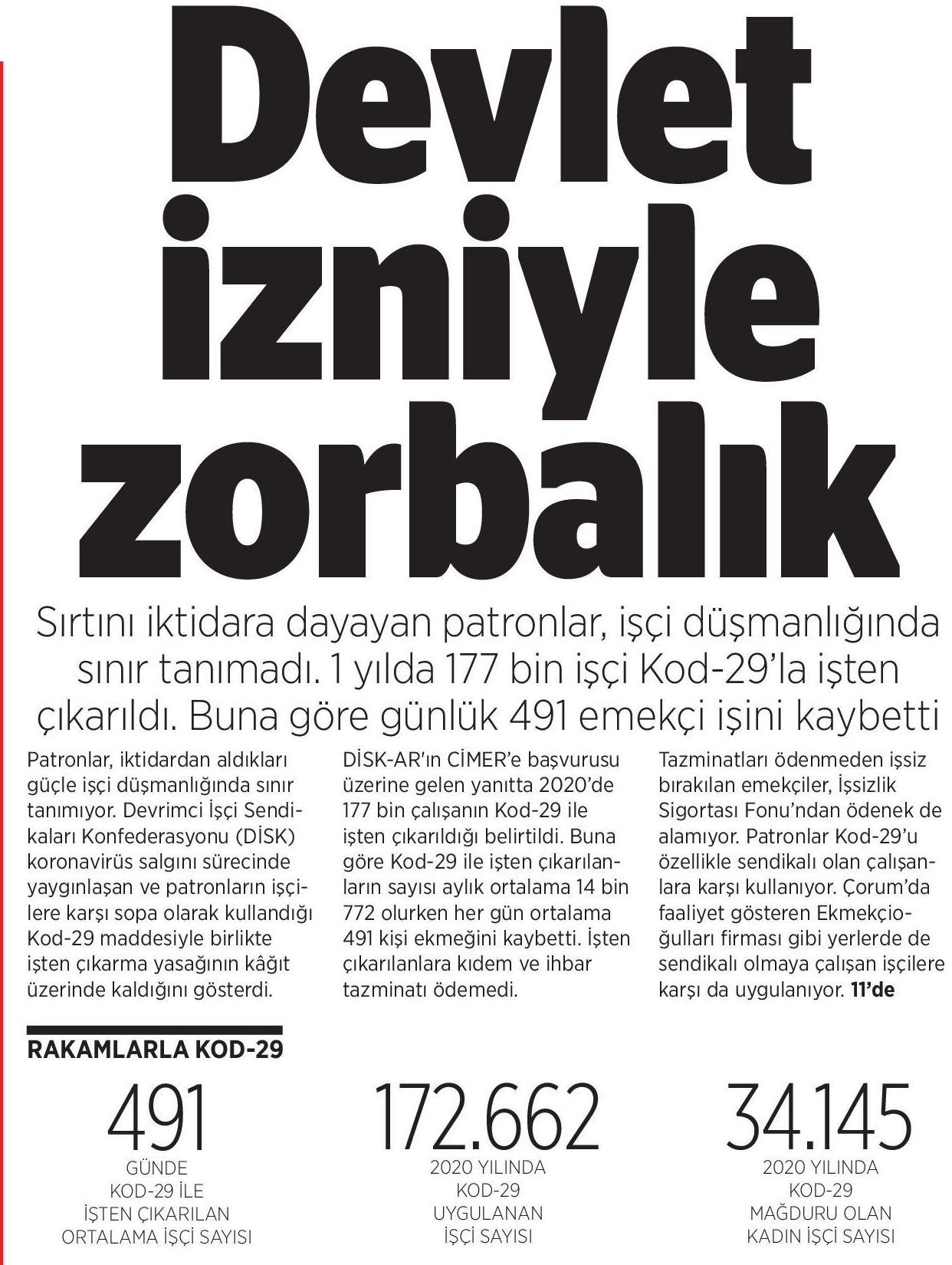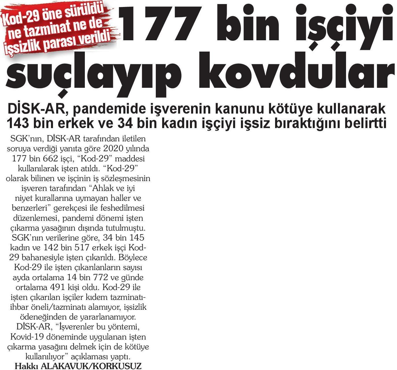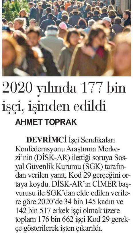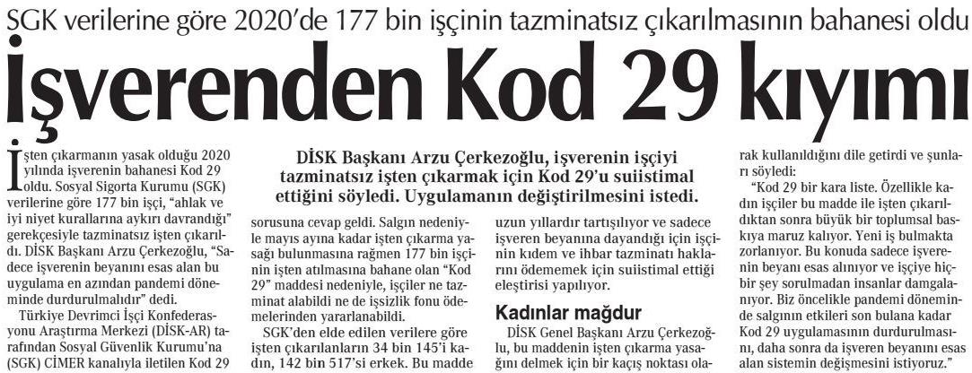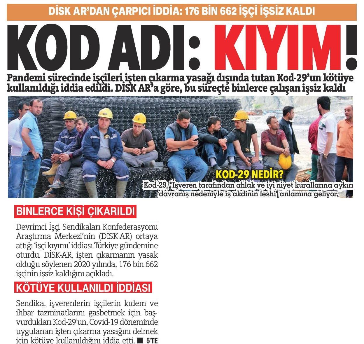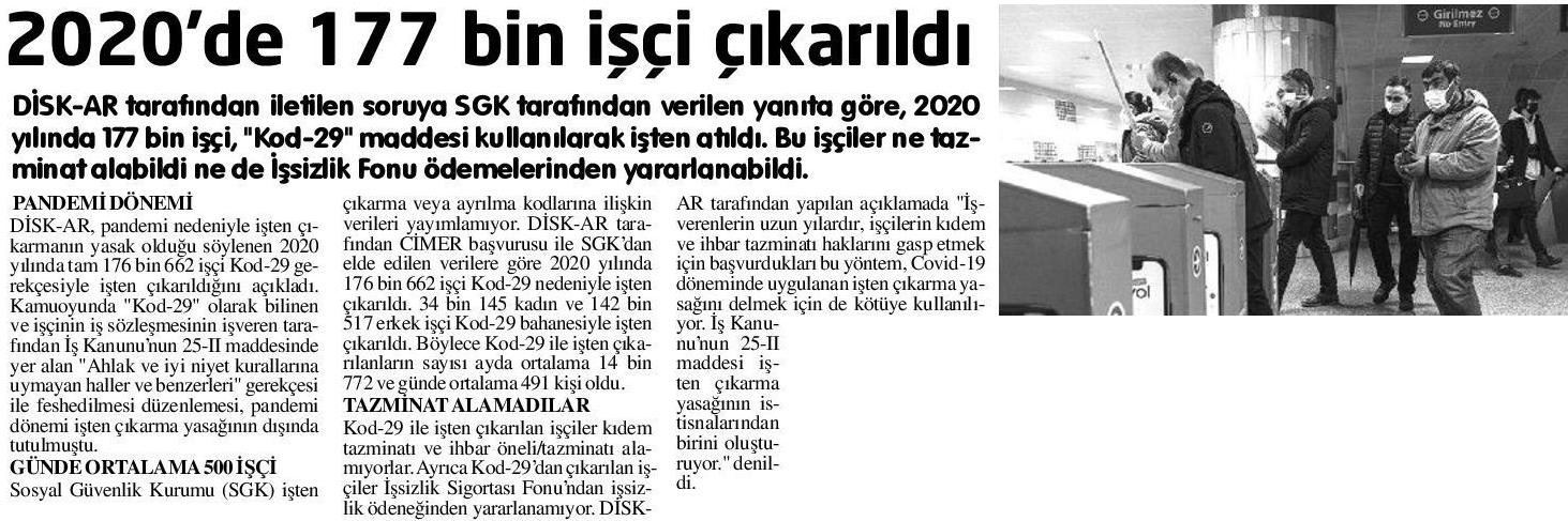 DİSK-AR tarafından hazırlanan ve 6 Nisan 2020’de yayımlanan “Kod-29 kıyımı: 143 bini erkek, 34 bini kadın toplam 177 bin işçi!” isimli haber bülteni 7 Nisan 2020 ve 8 Nisan 2021 tarihli yazılı basında geniş yer buldu.