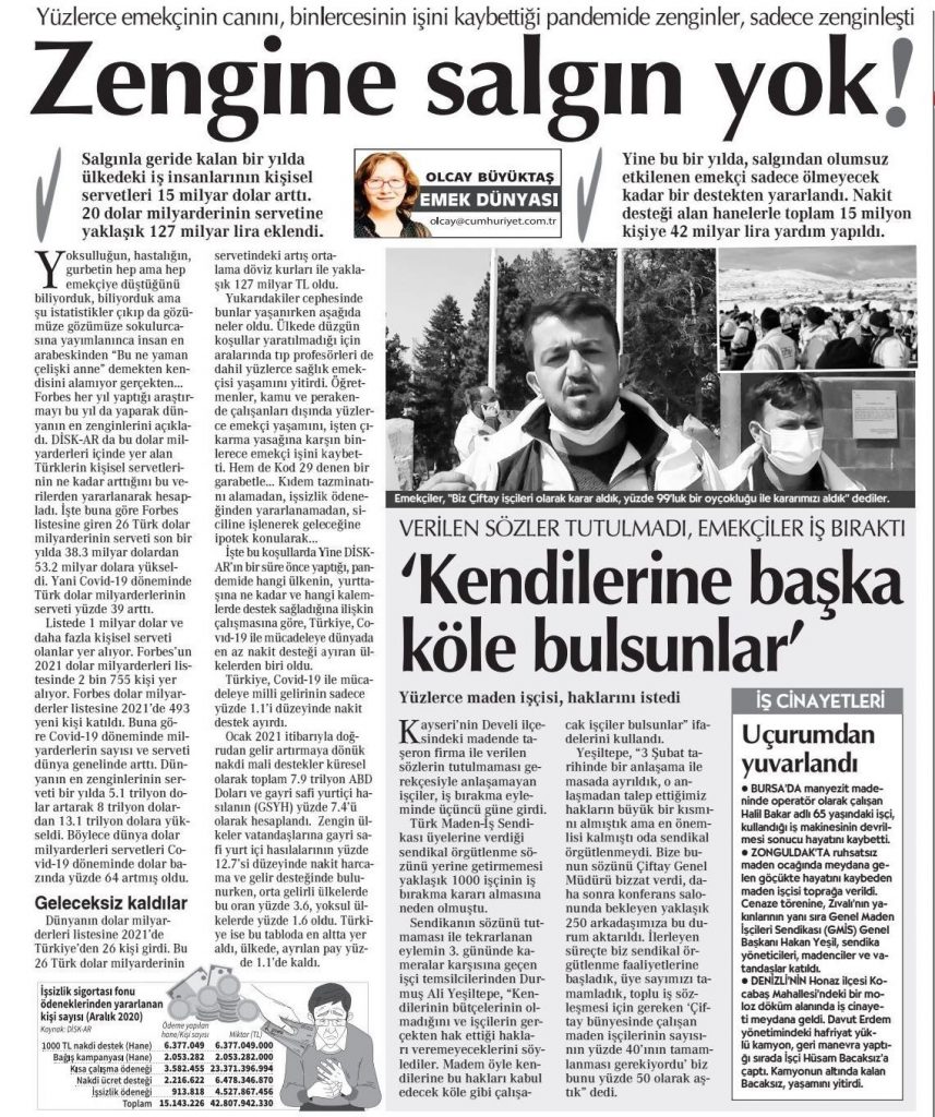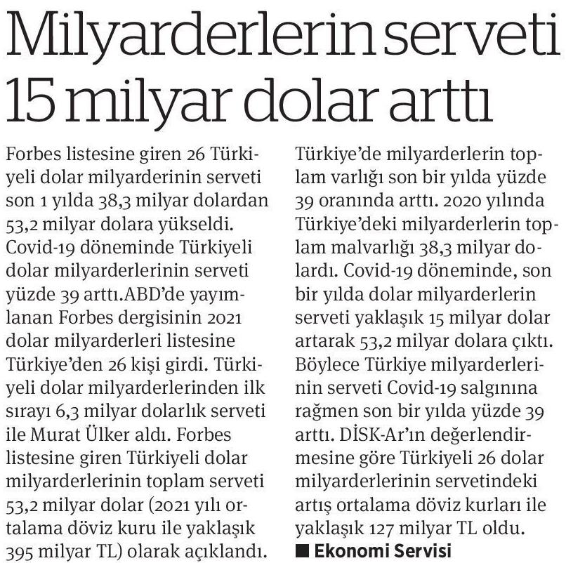 “Covid-19 döneminde Türkiye’de dolar milyarderlerinin serveti 15 milyar dolar arttı!” isimli haber bülteninin basına yansımaları 8 Nisan 2021 DİSK-AR tarafından hazırlanan ve 7 Nisan 2021 tarihinde yayımlanan “Covid-19 döneminde Türkiye’de dolar milyarderlerinin serveti 15 milyar dolar arttı!” isimli haber bültenine 8 Nisan 2021 tarihli BirGün ve Cumhuriyet gazetelerinde yer verildi. BirGün, 8 Nisan 2021. Cumhuriyet, 8 Nisan 2021.